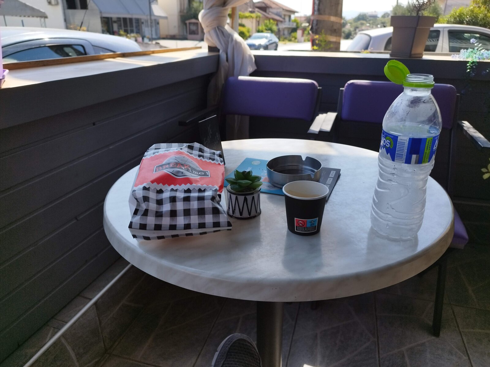 за кафе и кроасан. Малка улична тераса, тиха улица, чисти чаши на масата, кратко сядане и обратно към пътя.
