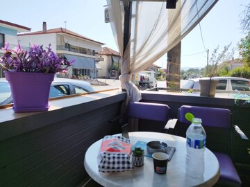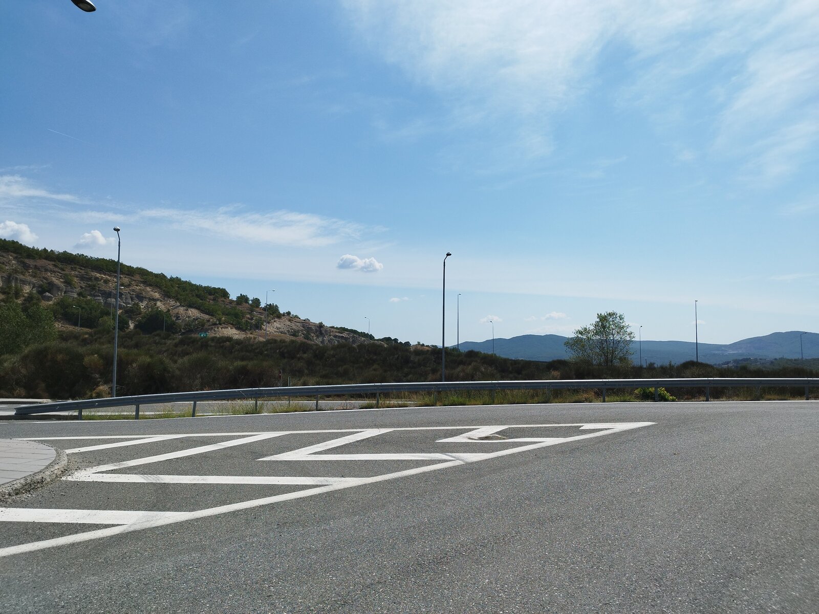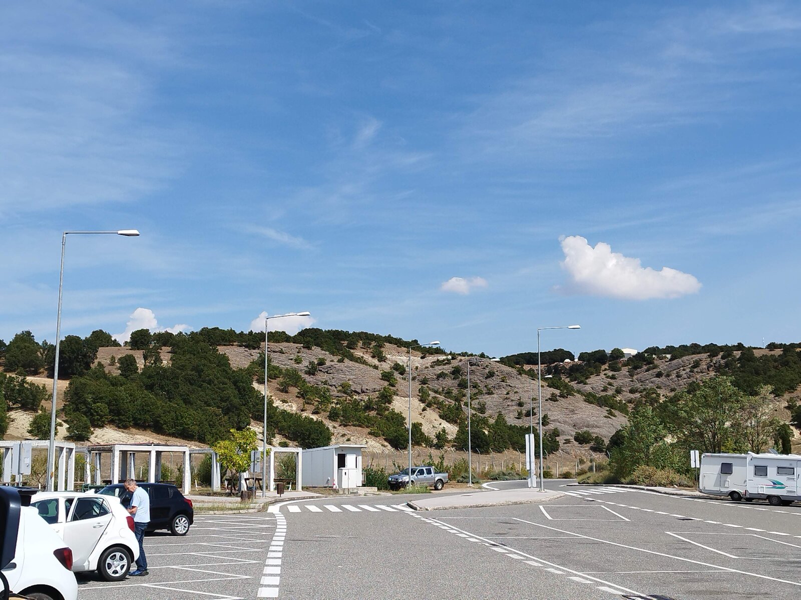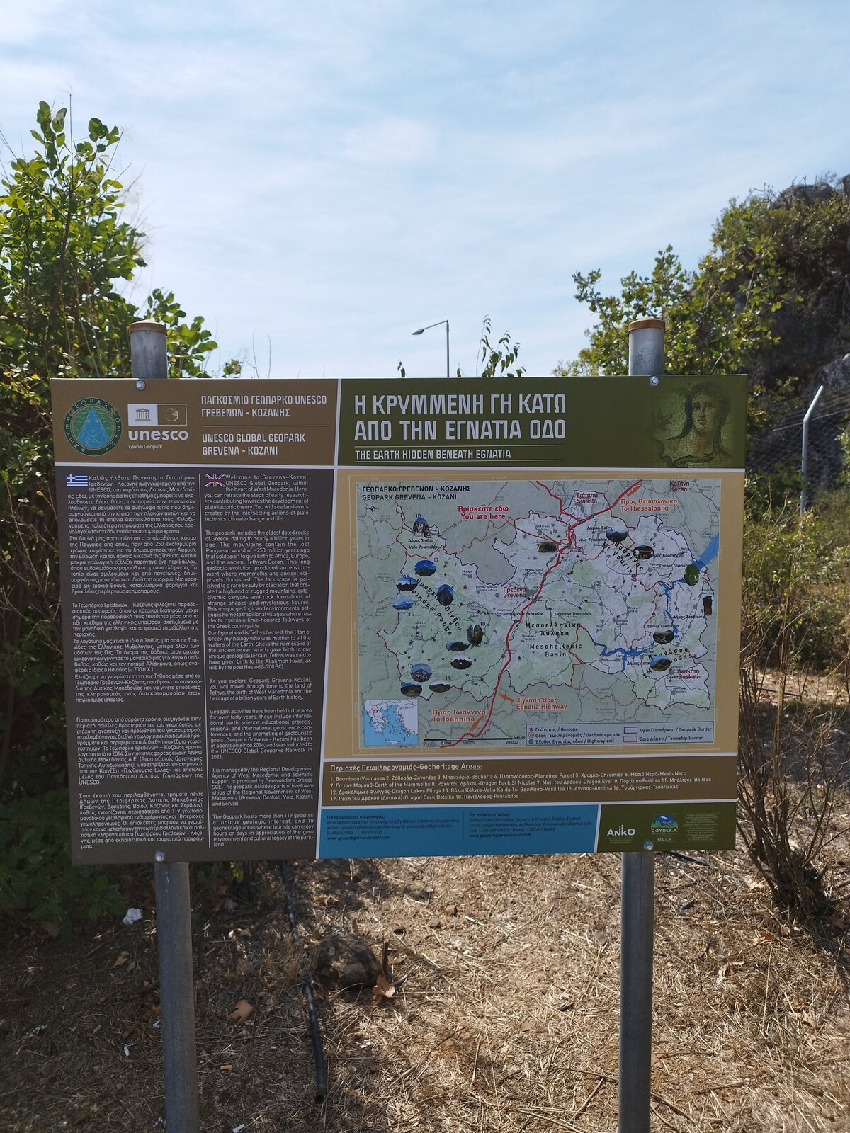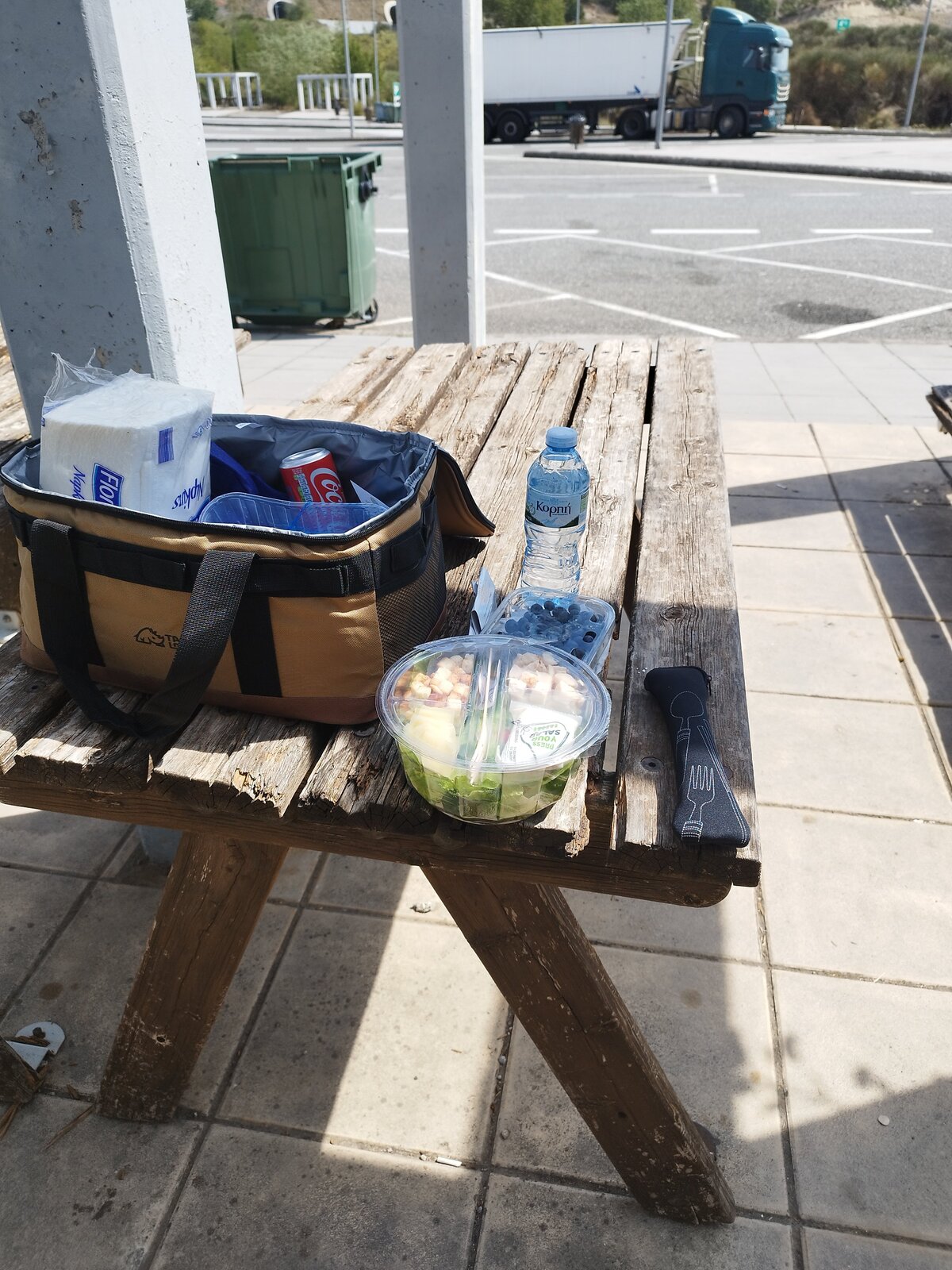 Преди Гревена, при Taxiarchis и Milea, намирам голям паркинг за тирове с беседки. Под дървената покривка е сянка, на масата от хладилната чанта вадя вода, салата и кутия боровинки, приборът е в черен калъф. Мирише на суха трева, от платното долита равномерен тътен на работещи двигатели. До паркинга има табела "The Earth Hidden Beneath Egnatia".