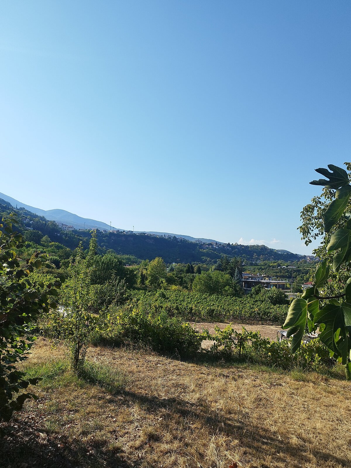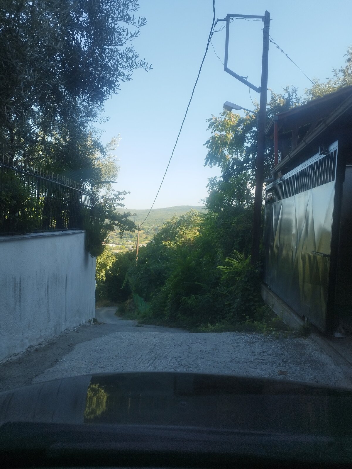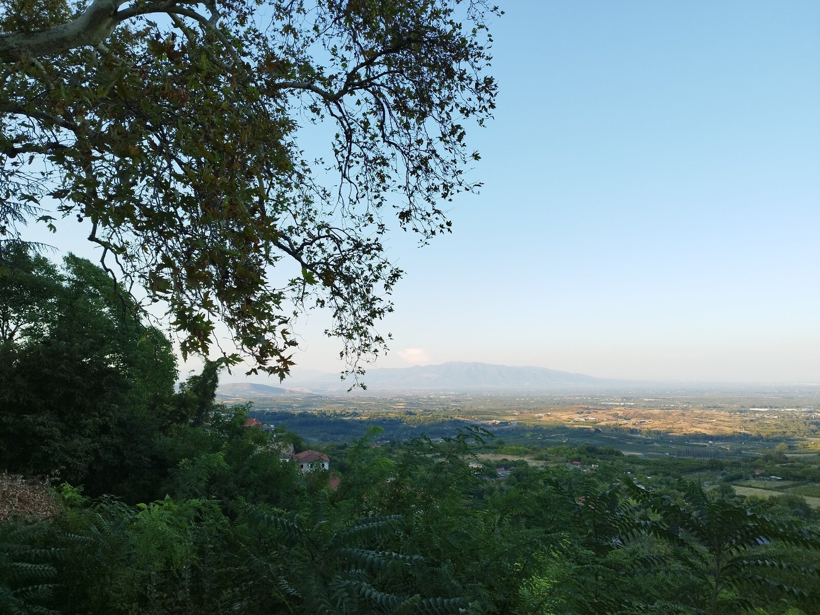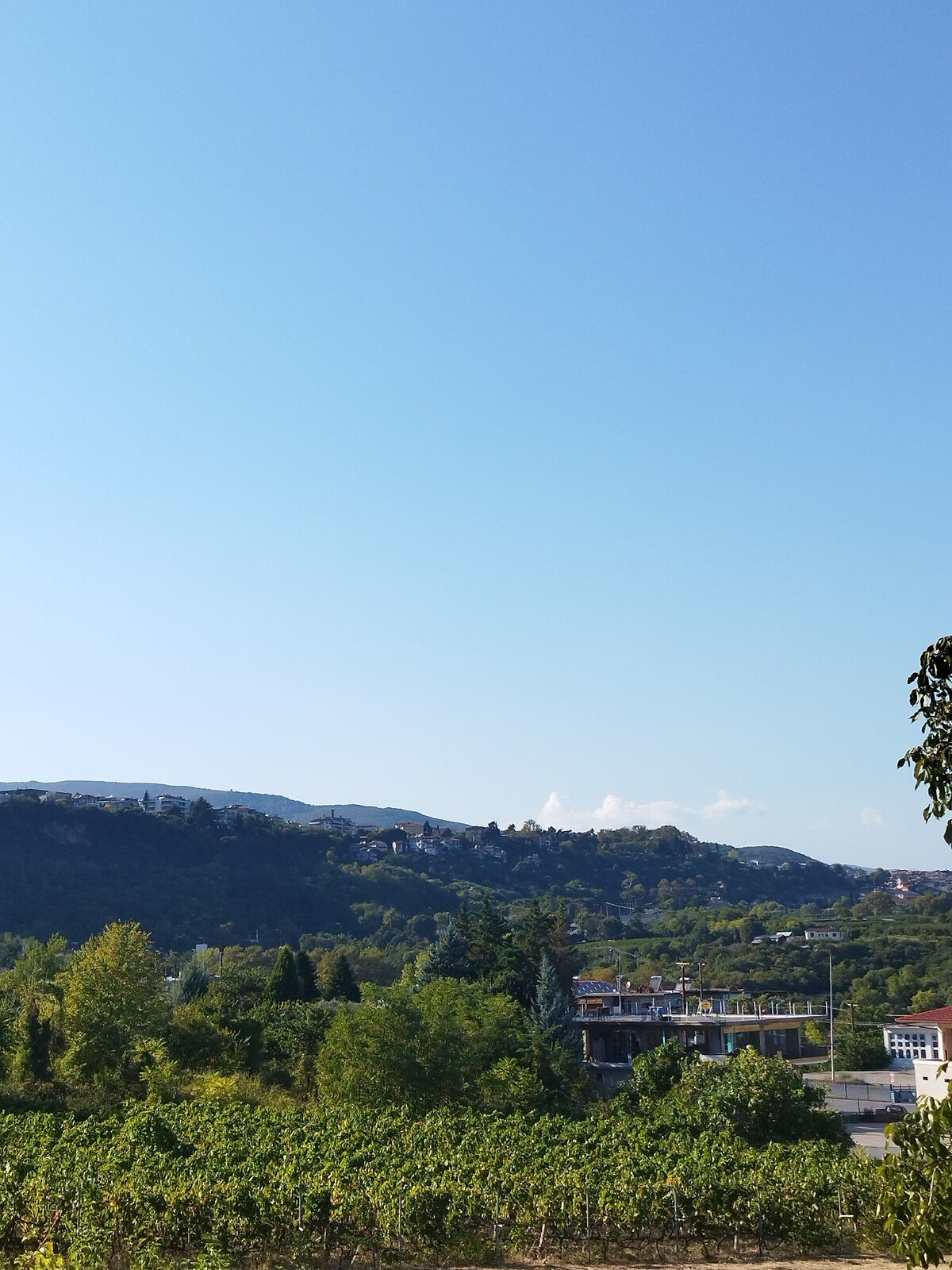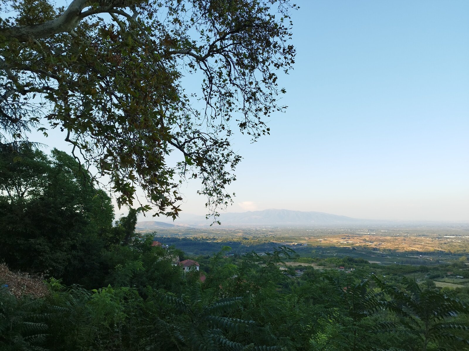 Waze ме водеше отгоре, портата на Esperides Spa Hotel е долу. Обиколих по стръмното и влязох. Стаята е голяма и комфортна. Пред хотела - равнина, лозя, ниски къщи...