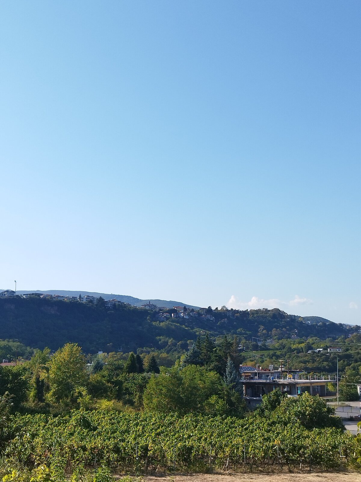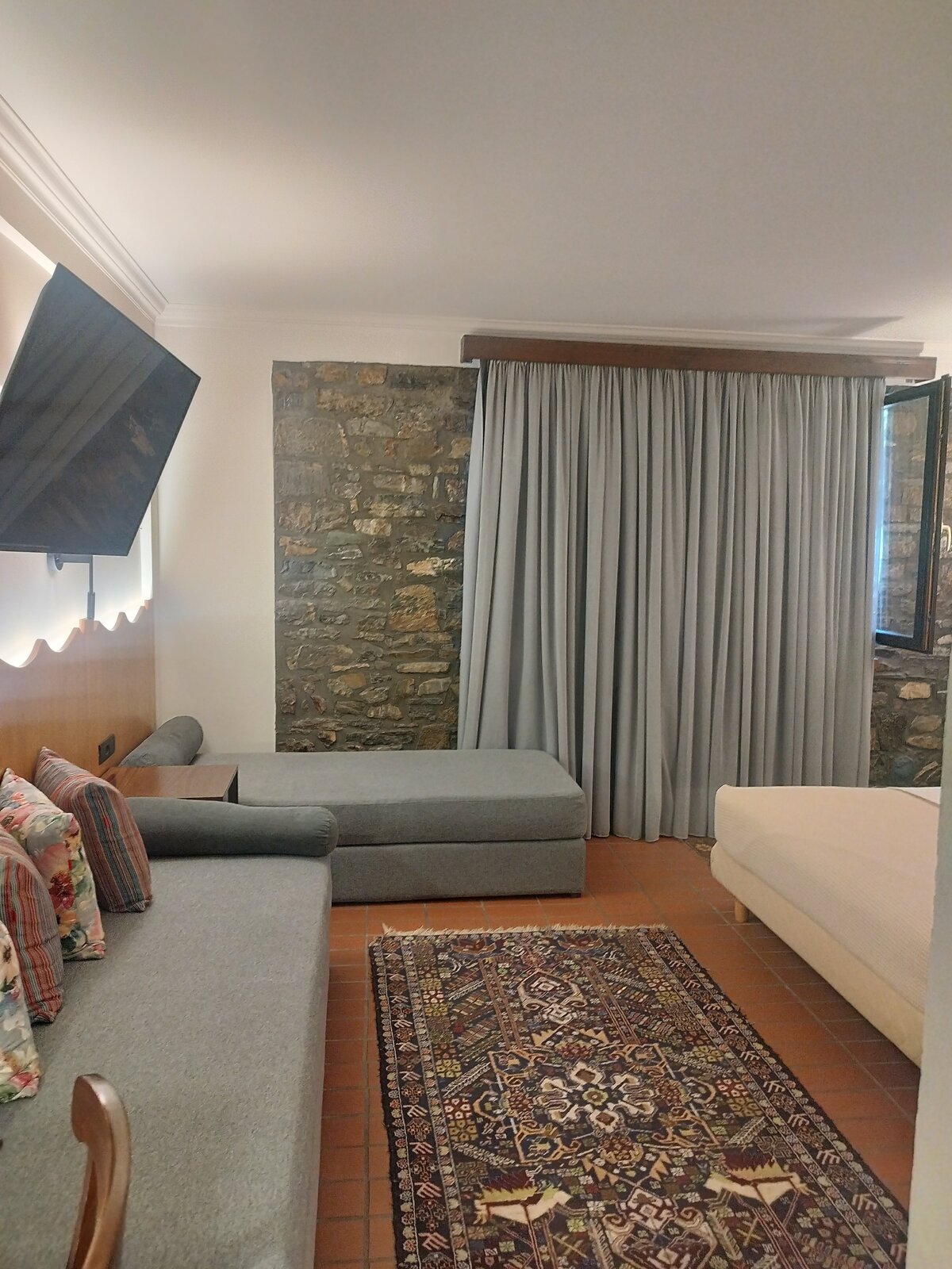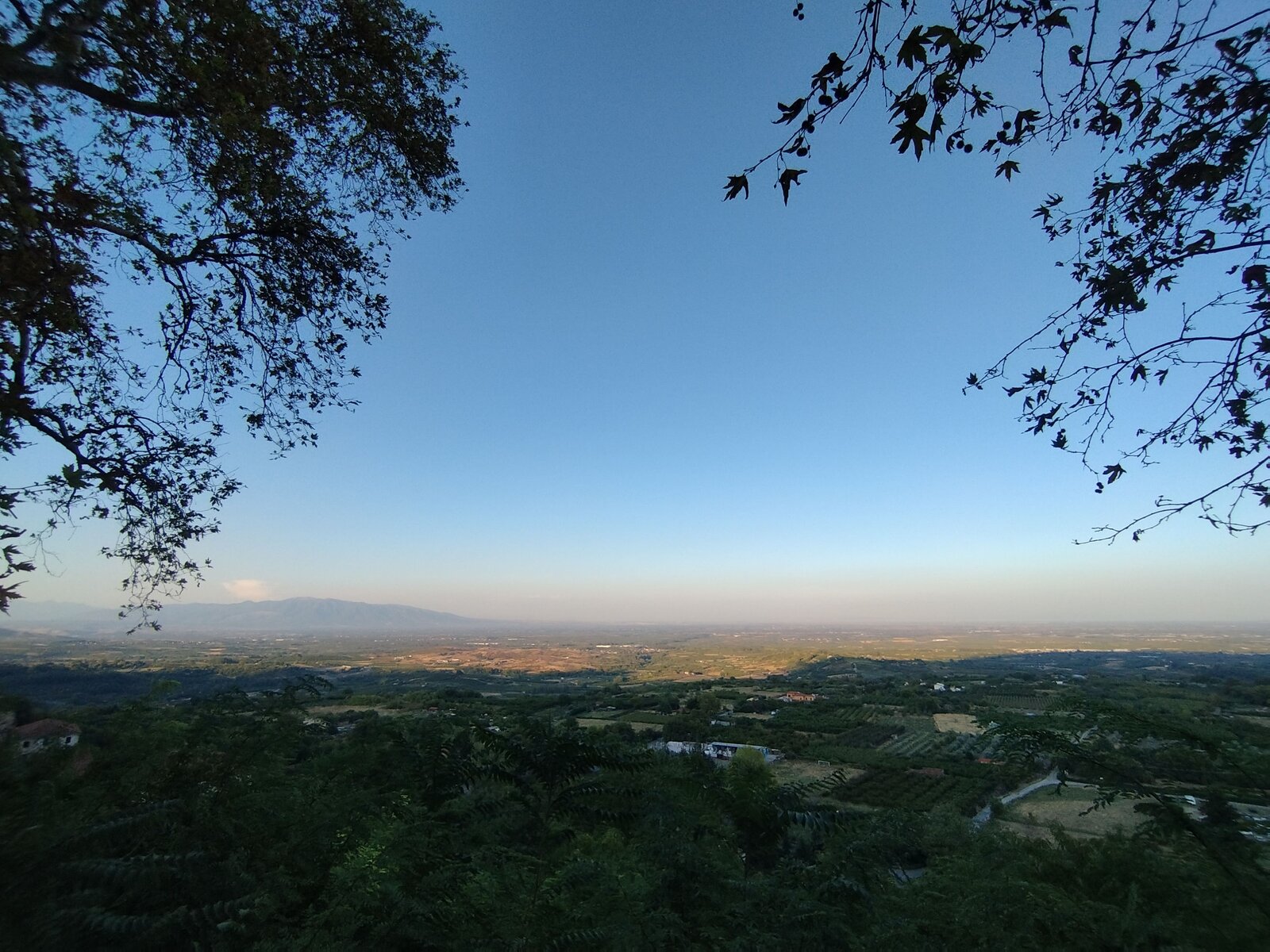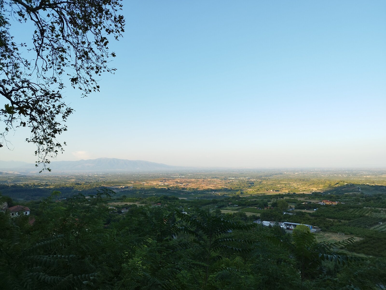 Waze ме водеше отгоре, портата на Esperides Spa Hotel е долу. Обиколих по стръмното и влязох. Стаята е голяма и комфортна. Пред хотела - равнина, лозя, ниски къщи...