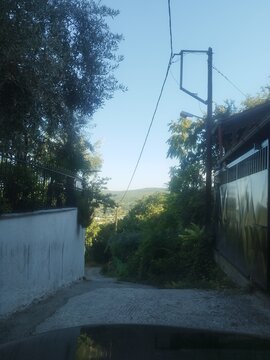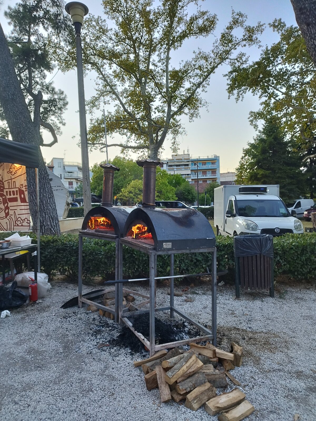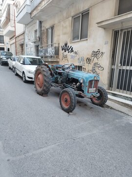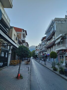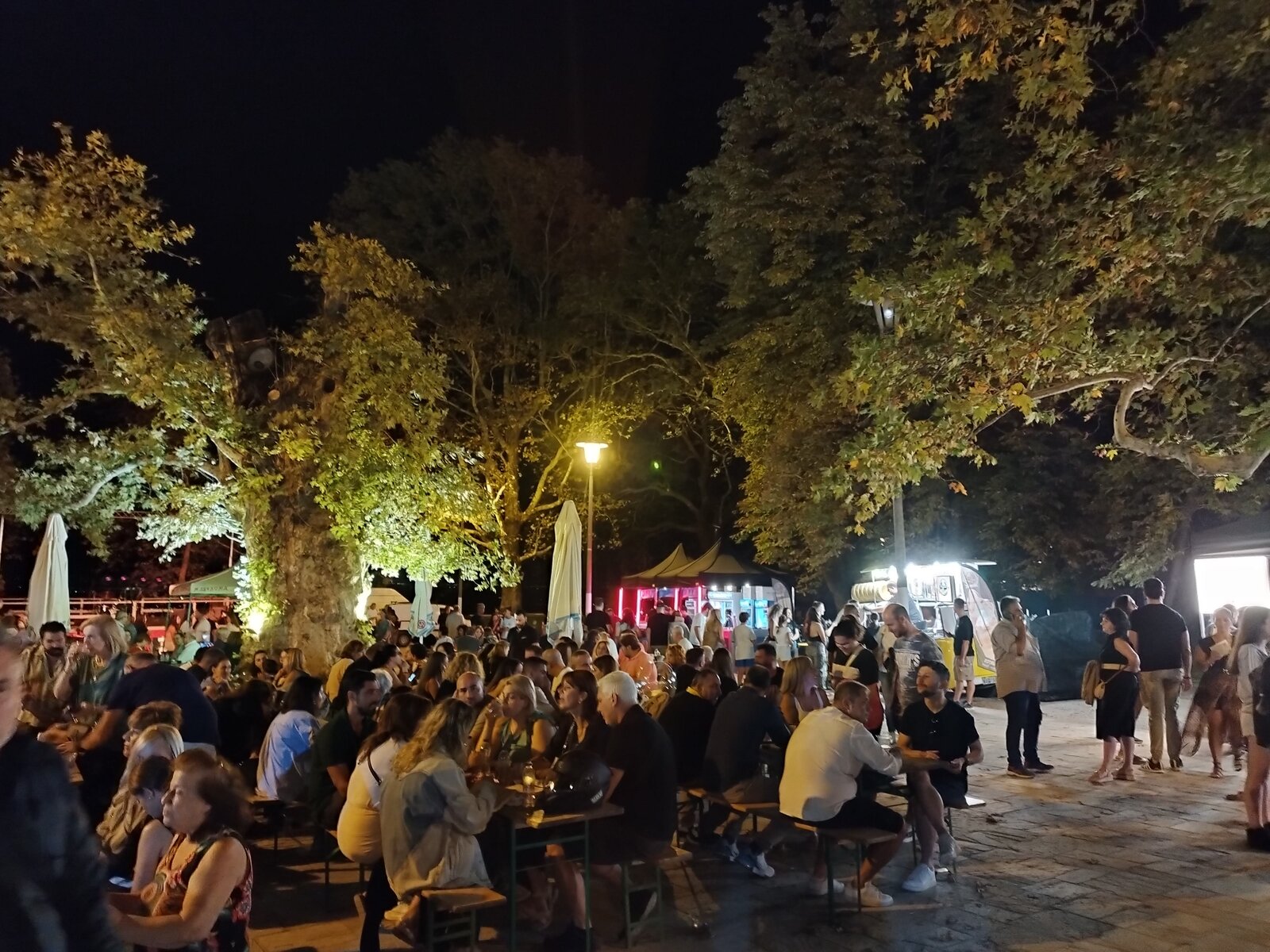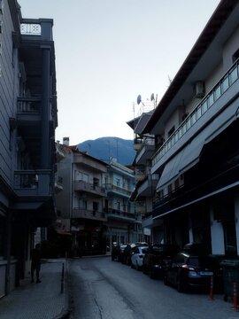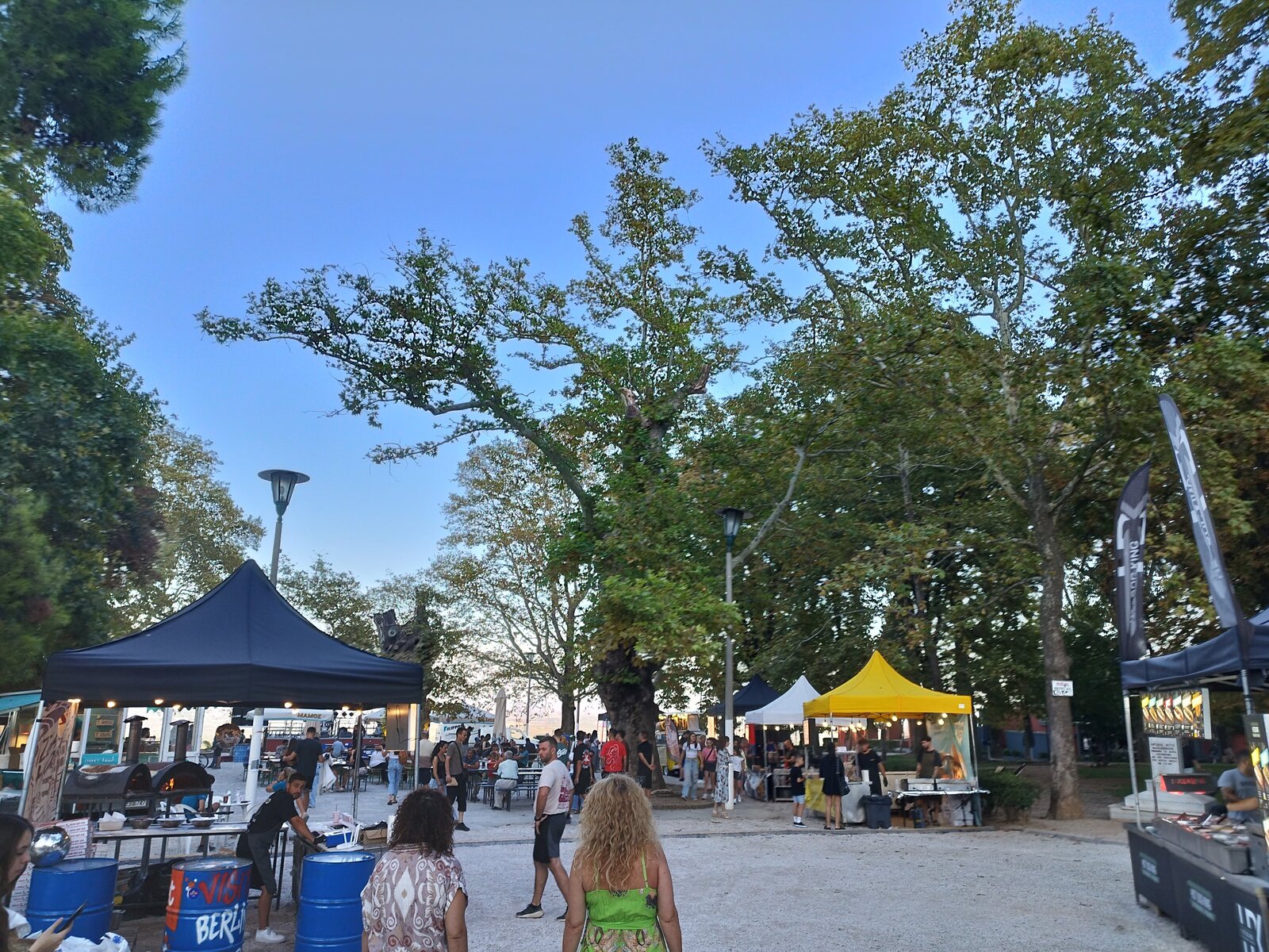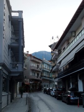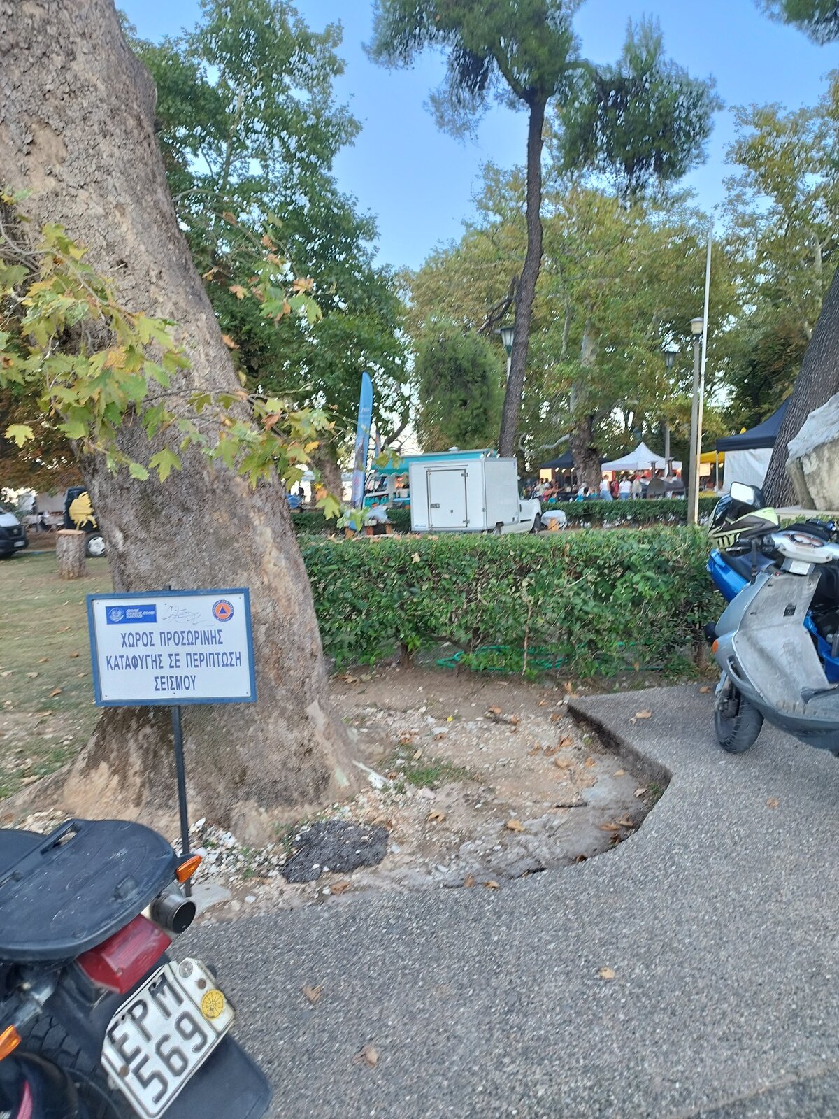 Минах през Municipal Park of Naoussa - шатри, сцена, две пещи на дърва. Мирише на печена пица и улична храна. Оттам пеш към центъра: улици, фасади, коли. На една уличка син трактор се открояваше сред костюмари. Градът беше пълен и шумен.