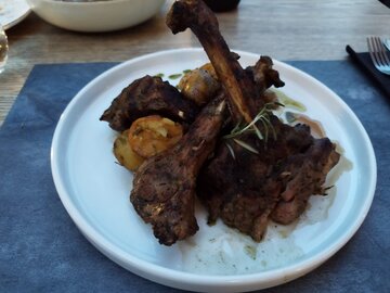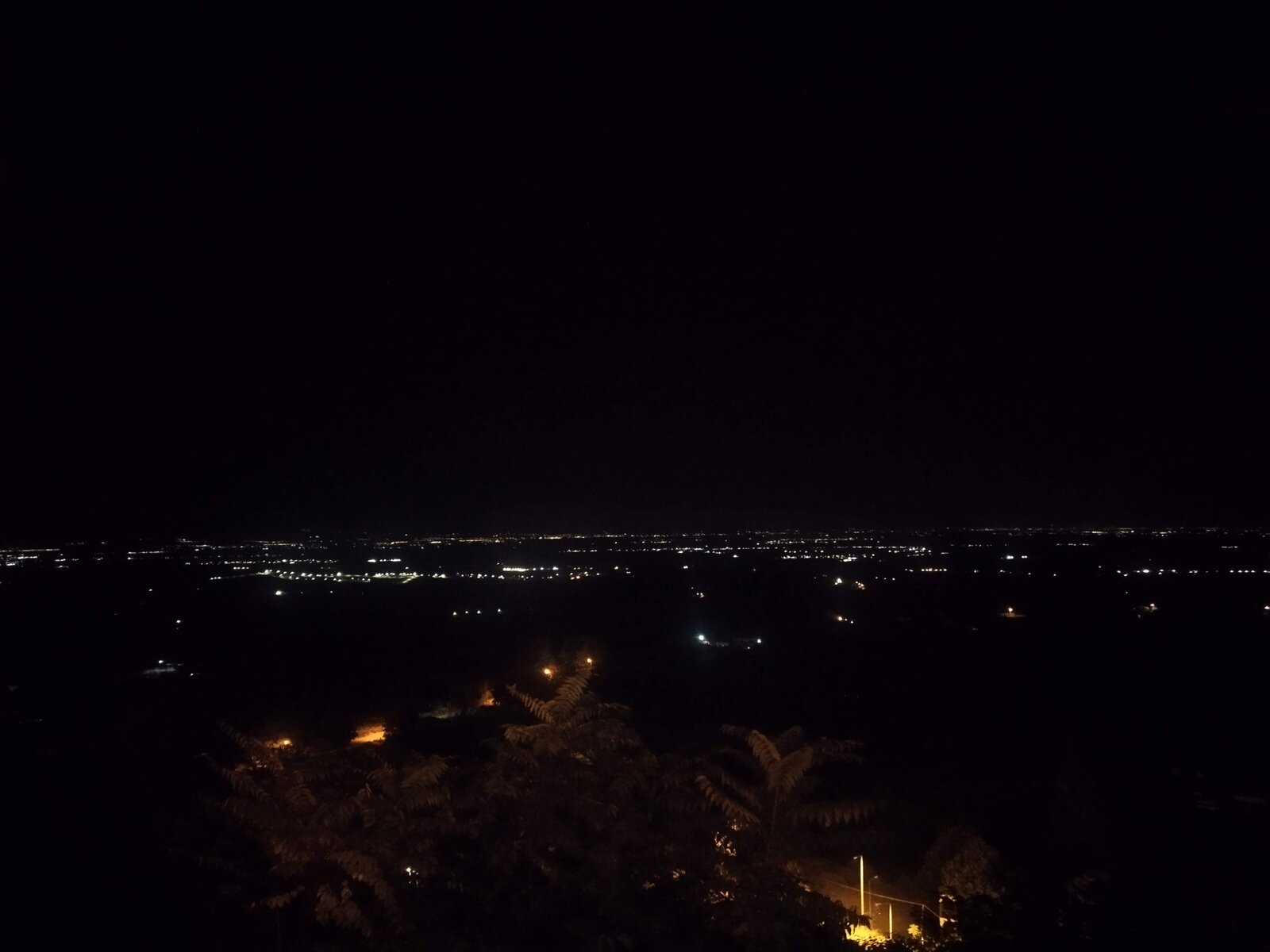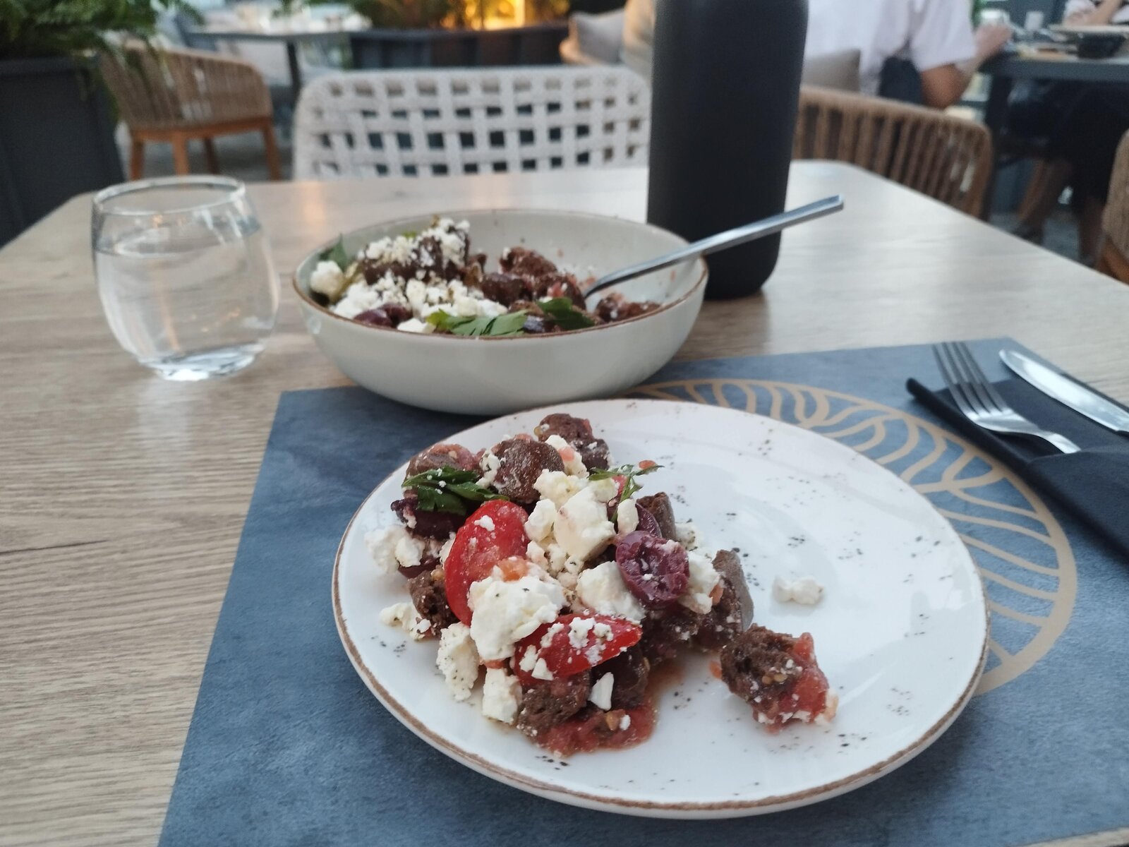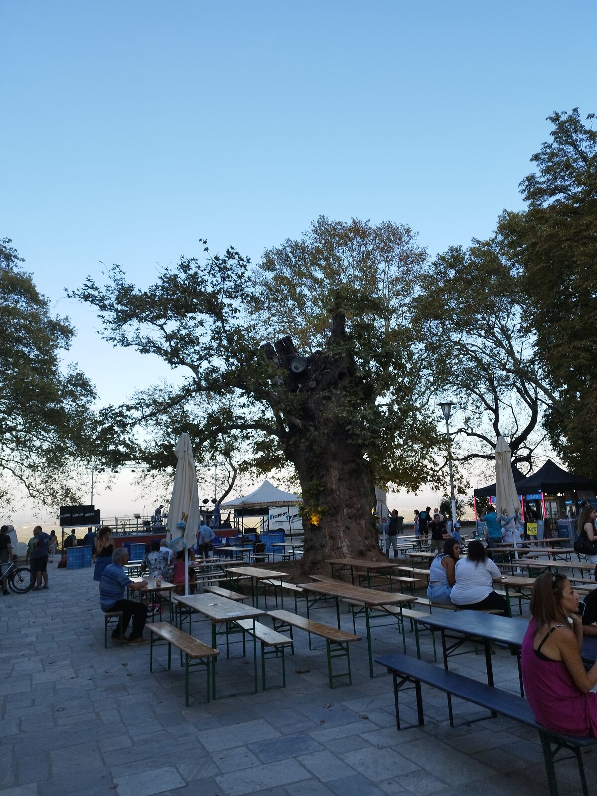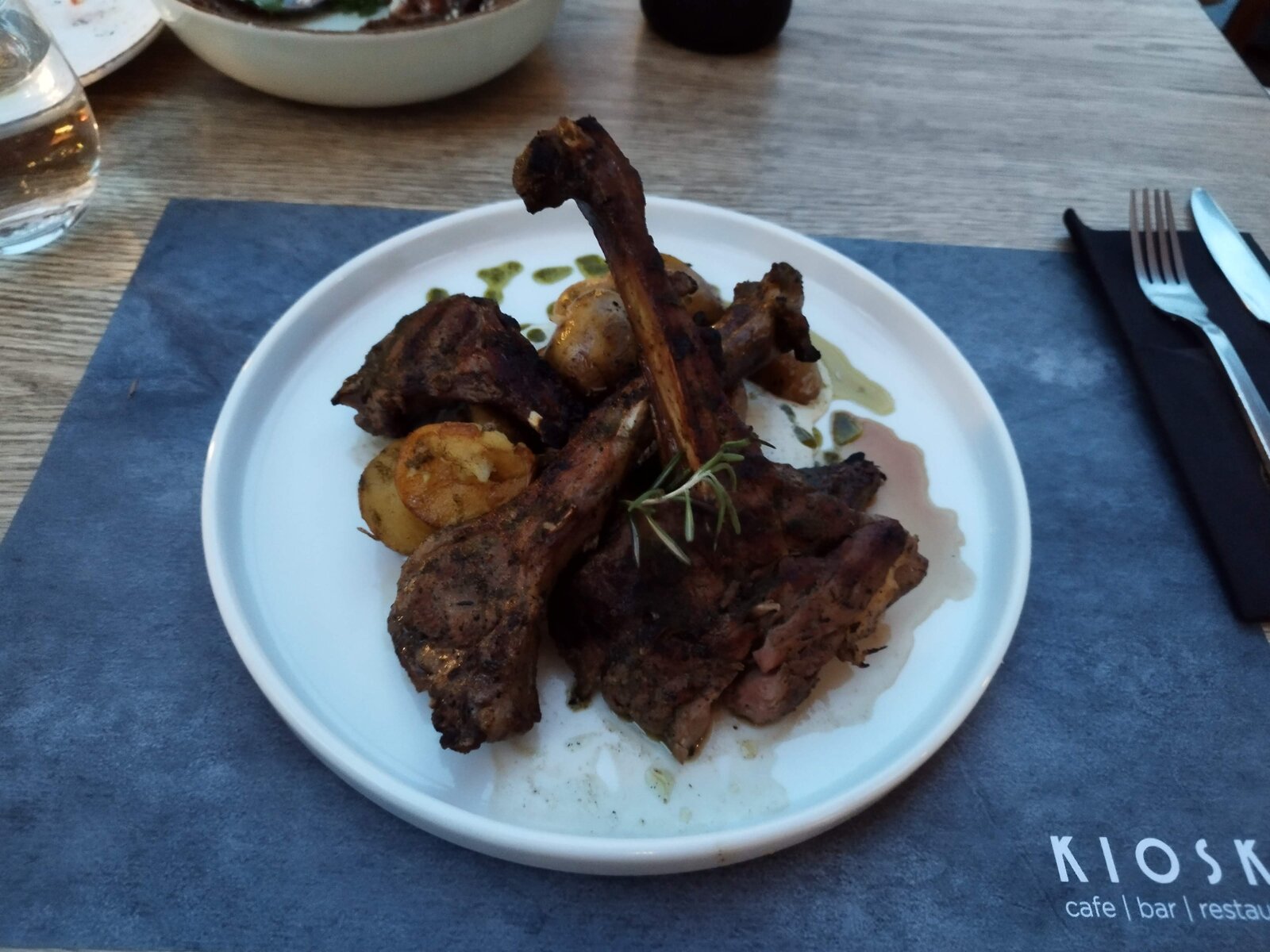 После се върнах в парка и избрах Kioski на метри от площадчето, най-вече заради гледката към равнината. Салата и ребърца. Накрая кафе и десерт. По тъмно стана прохладно, връхната дреха беше на място. Долу - разпръснати светлини.