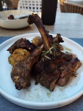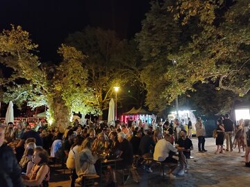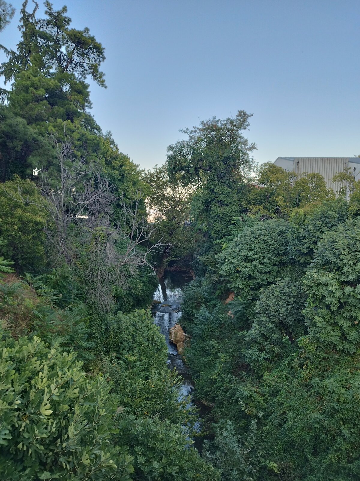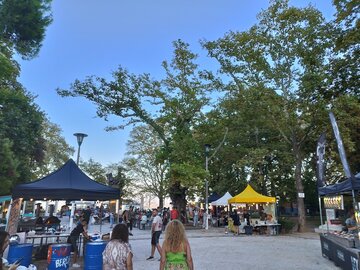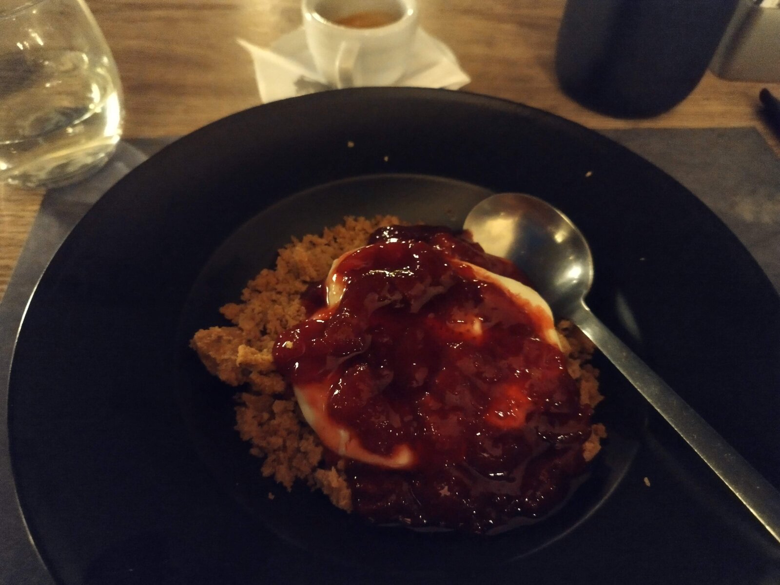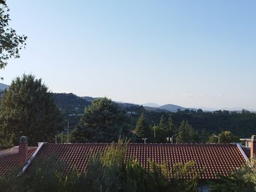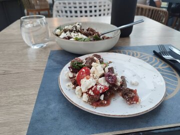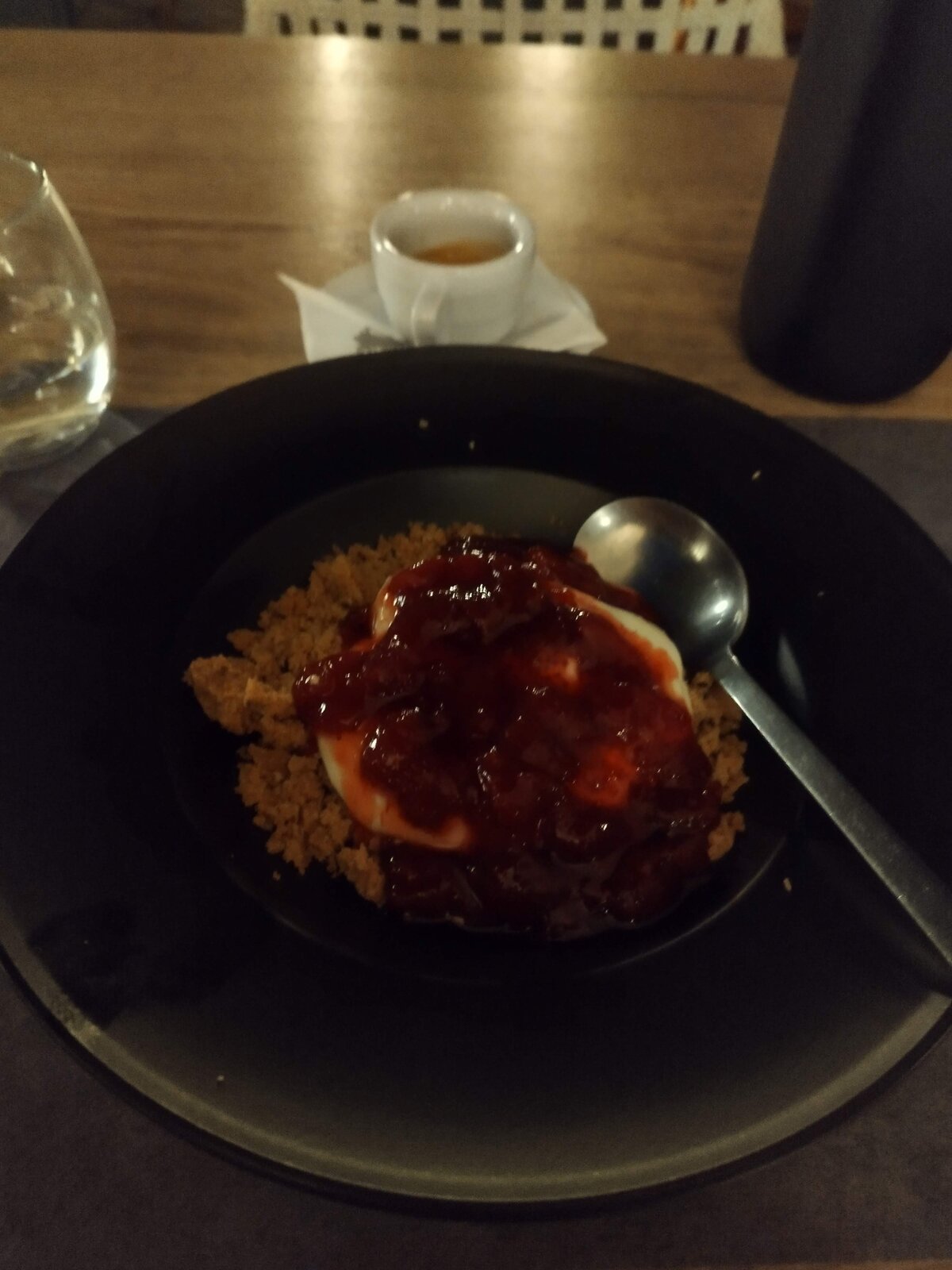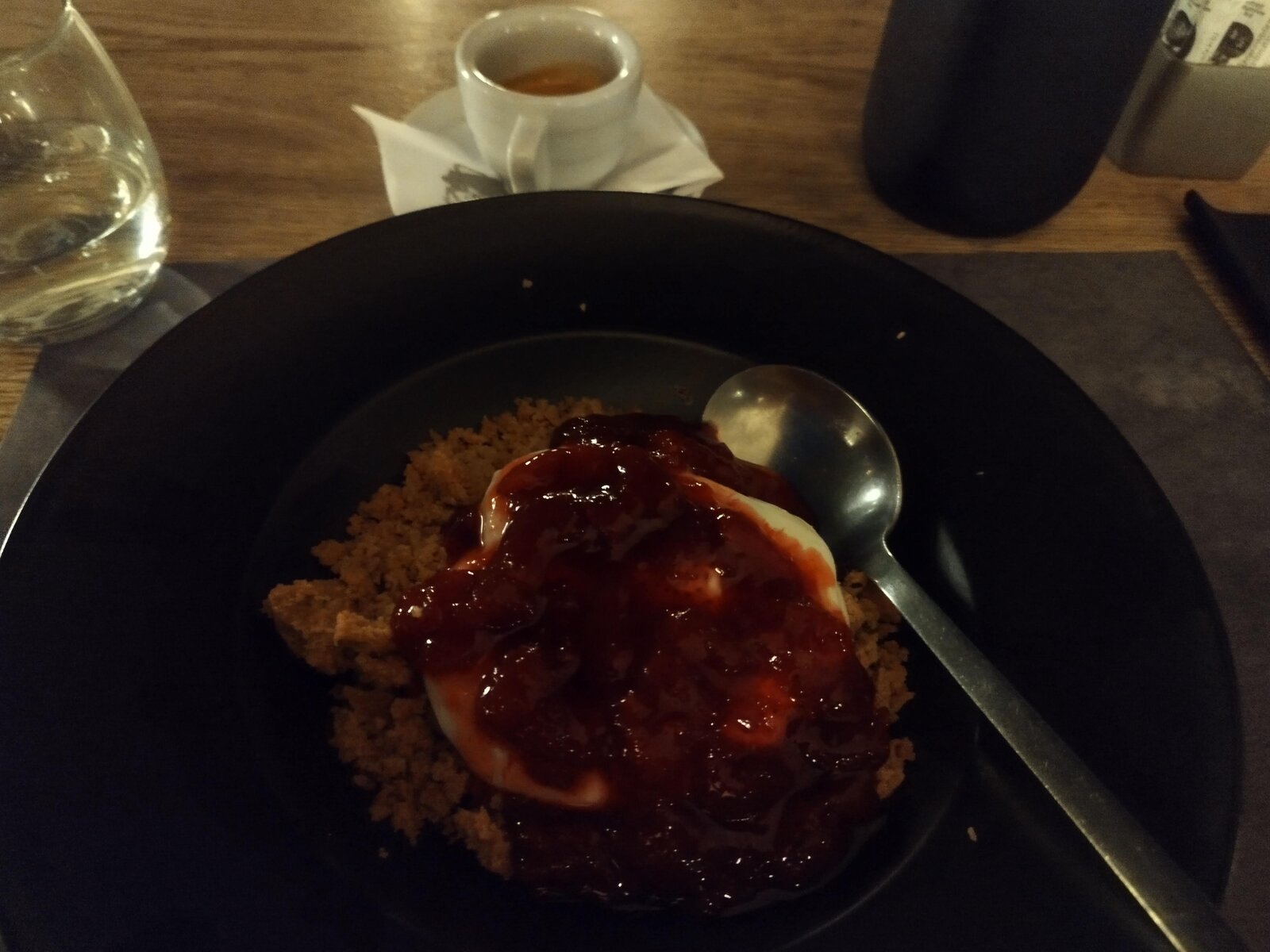 После се върнах в парка и избрах Kioski на метри от площадчето, най-вече заради гледката към равнината. Салата и ребърца. Накрая кафе и десерт. По тъмно стана прохладно, връхната дреха беше на място. Долу - разпръснати светлини.