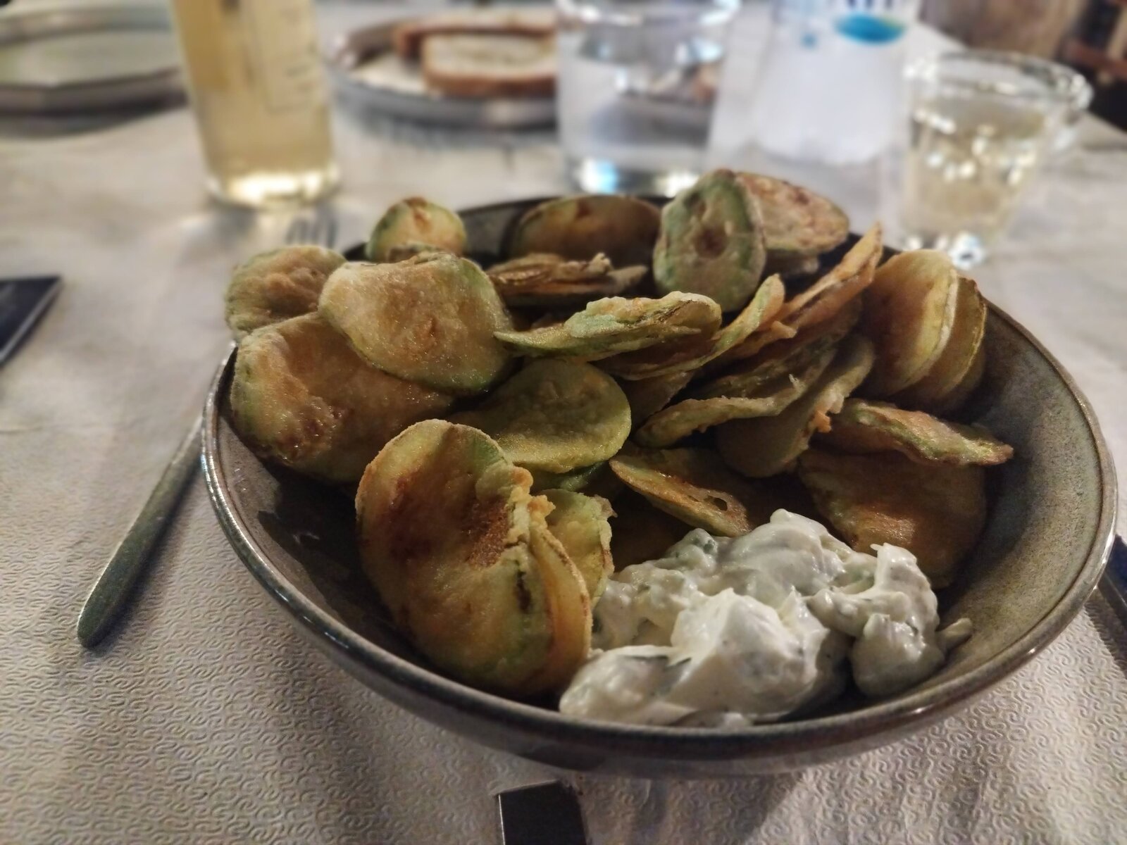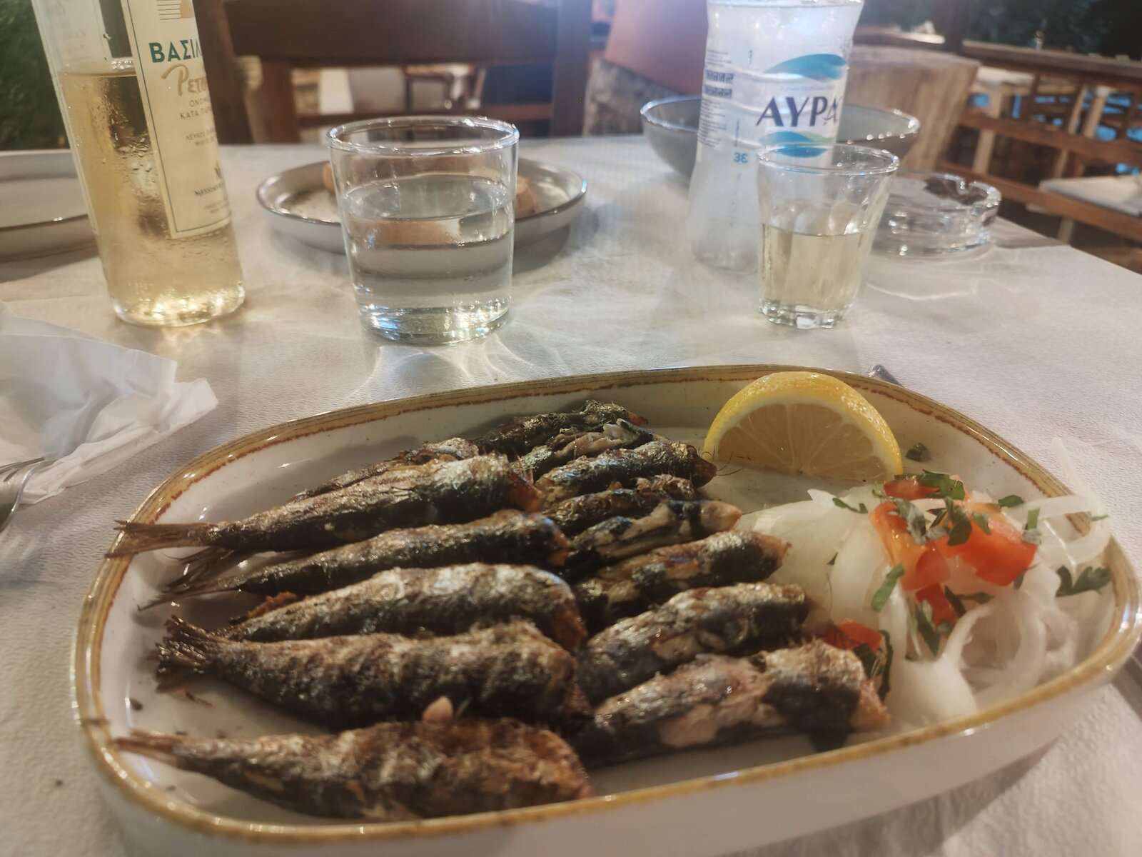 В хотела - бързо преобличане и избор на заведение за вечеря. Бях ги видял отдалеч по-рано при разходката и само проверих рейтинга. Отидох в Idaniko tavernaki / Ιδανικό Ταβερνάκι. В менюто в Google бях видял рибка и си я поръчах - изключително вкусна.