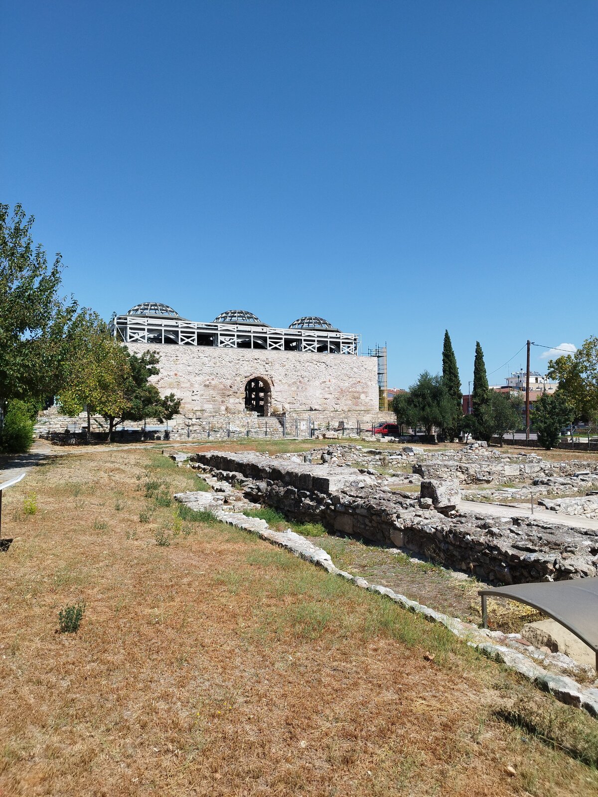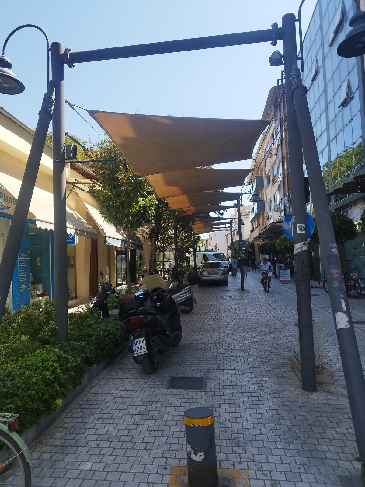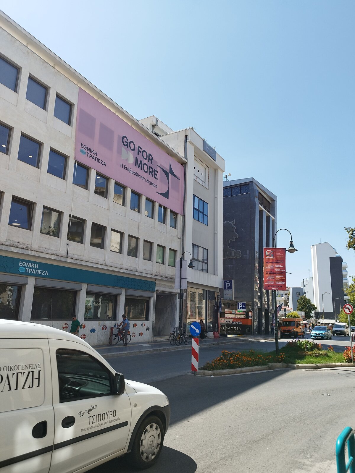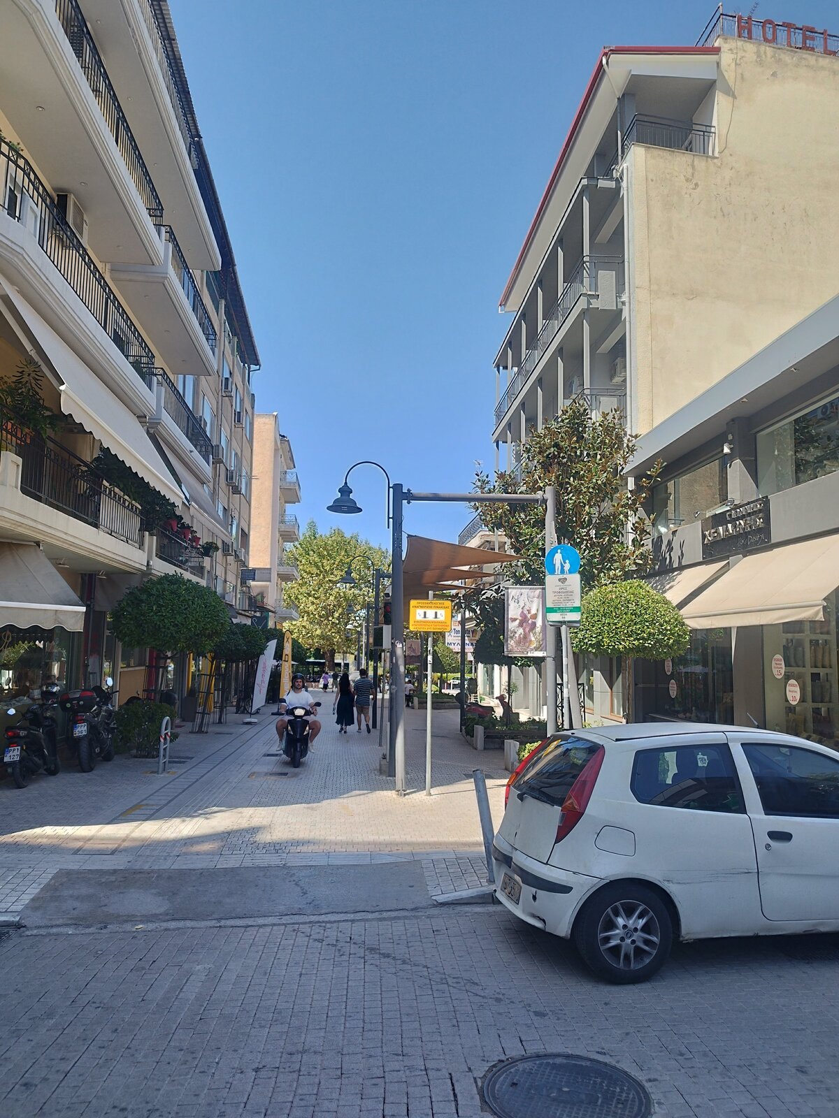 По обед стигнах Лариса - търсенето на паркинг в центъра беше предизвикателство. Към центъра тръгнах вече изморен. Компактна централна част, може би не я обиколих цяла. Основното, което видях, е това, което виждах и преди - каманаци от постройки, възстановени исторически стени и, разбира се, храм. Не се усеща отначало, но центърът всъщност е с малък хълм. Много жив град беше - много хора. И светофар - за пръв път в Гърция пресичах на светофар. Гърците паркират където има място - без значение от знаците. Същото се оказа и за пешеходни светофари: няма ли коли, всички пресичат, ако ще и сняг да вали - направо на червено, цялата тълпа с едно движение не ти дава право на мнение. В Пловдив, моята провинция, повечето спазваме червено за пешеходци.