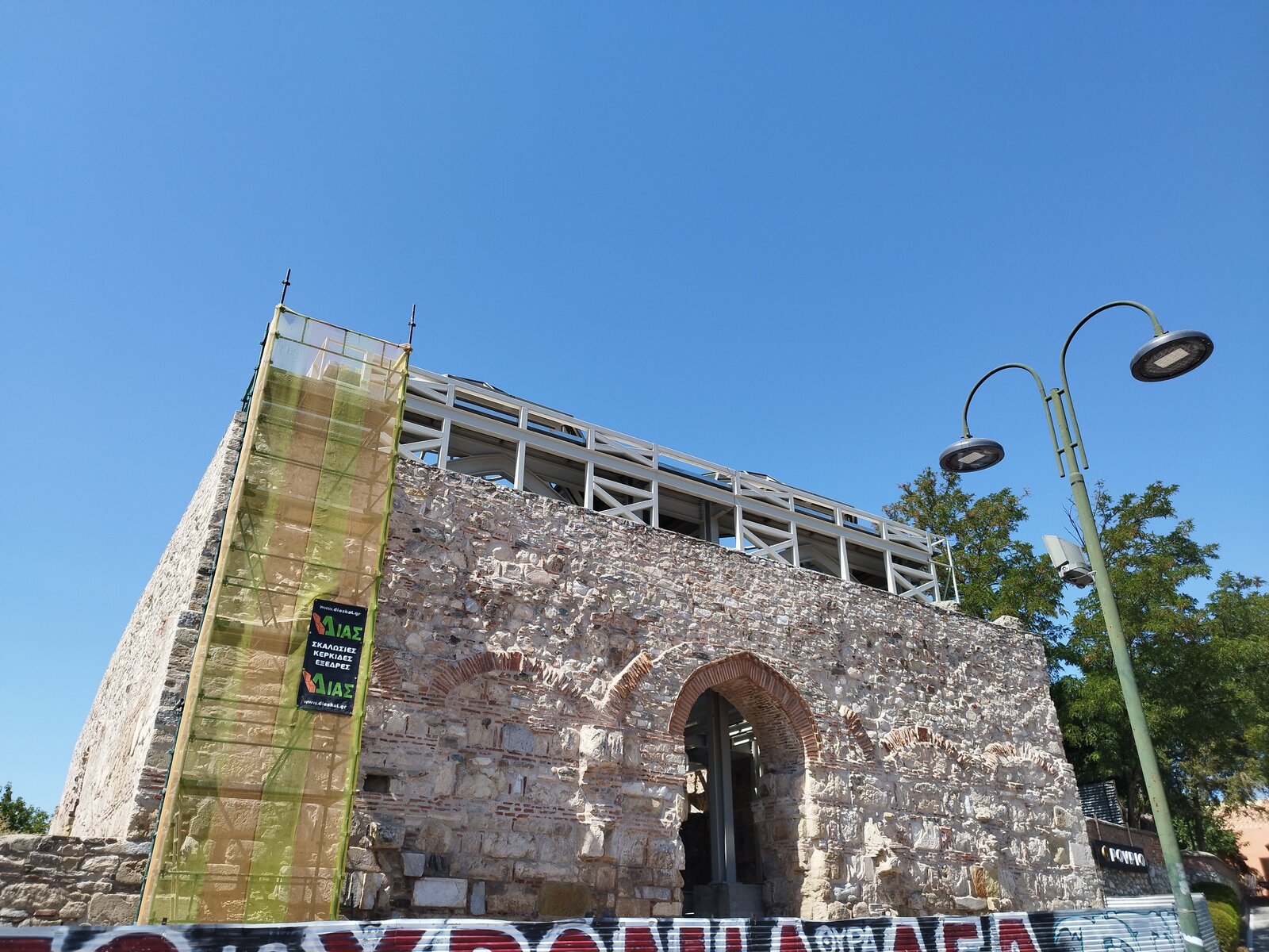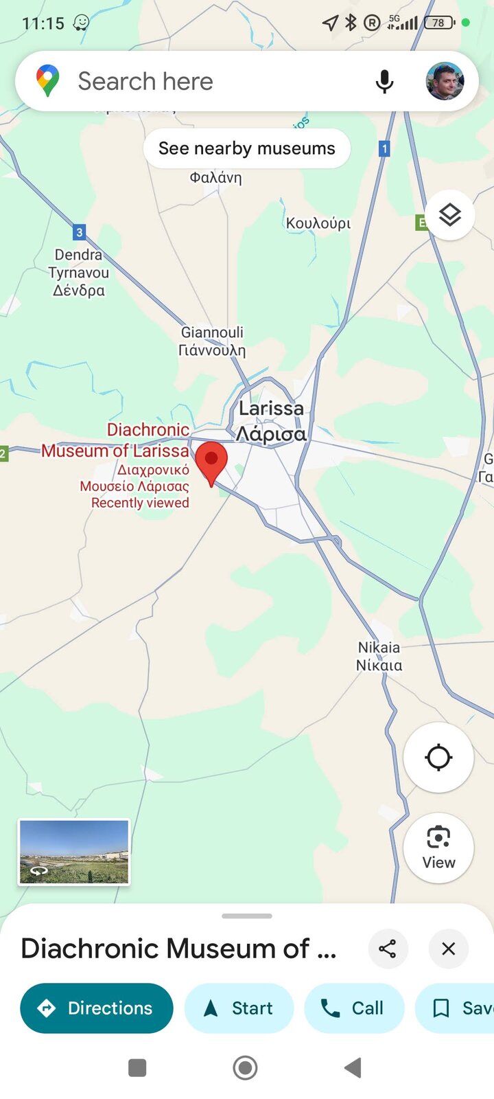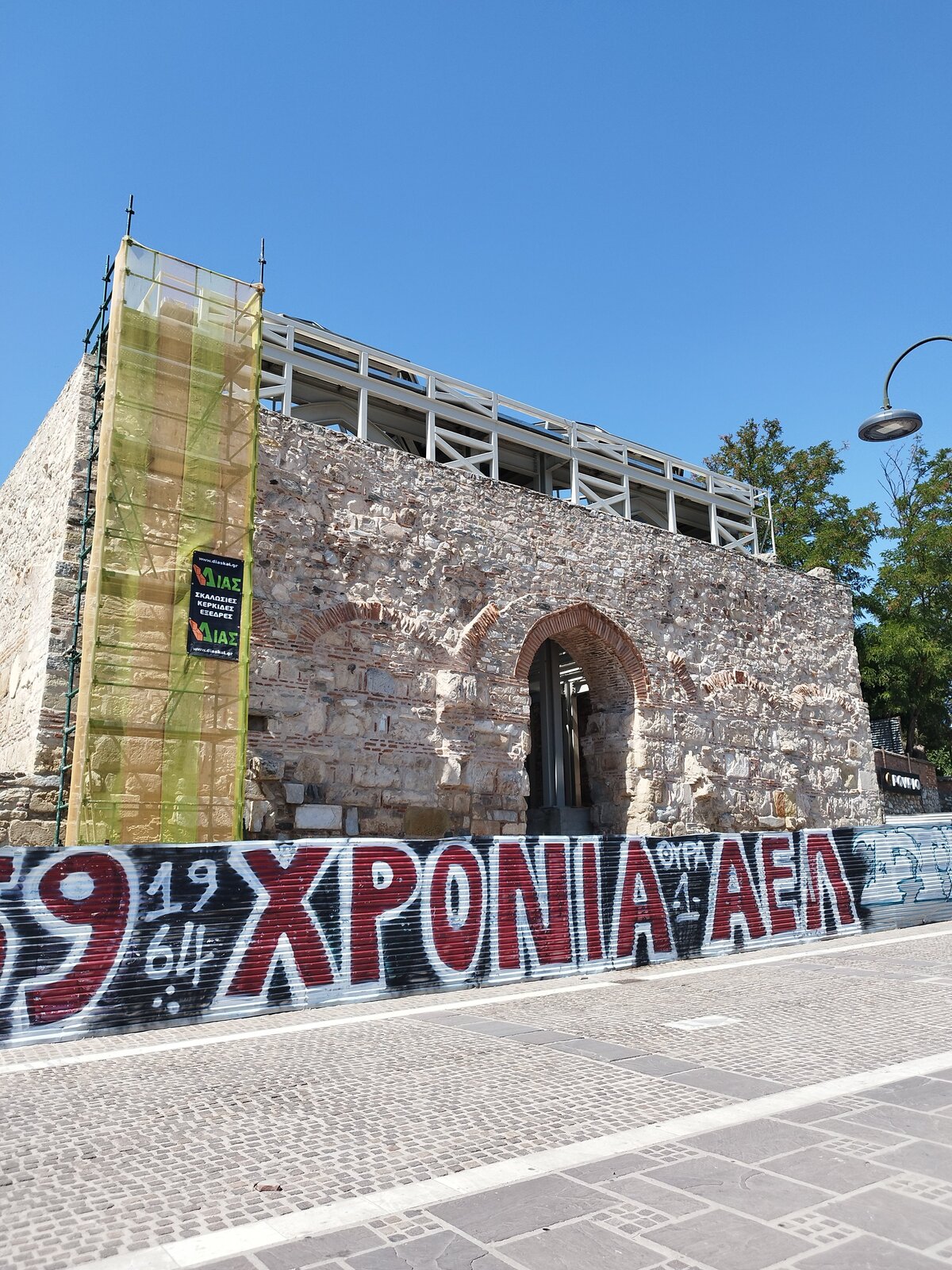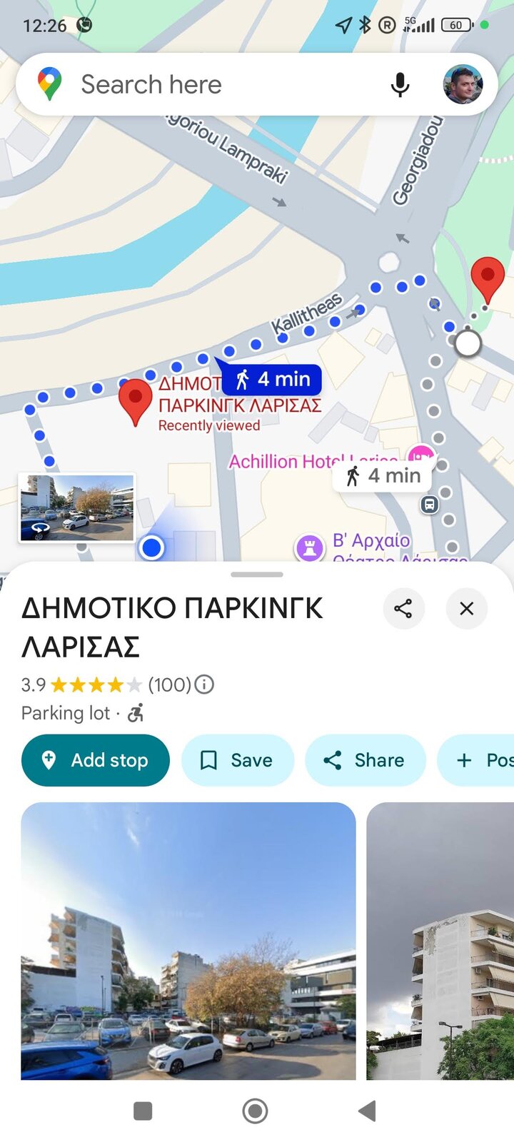 По обед стигнах Лариса - търсенето на паркинг в центъра беше предизвикателство. Към центъра тръгнах вече изморен. Компактна централна част, може би не я обиколих цяла. Основното, което видях, е това, което виждах и преди - каманаци от постройки, възстановени исторически стени и, разбира се, храм. Не се усеща отначало, но центърът всъщност е с малък хълм. Много жив град беше - много хора. И светофар - за пръв път в Гърция пресичах на светофар. Гърците паркират където има място - без значение от знаците. Същото се оказа и за пешеходни светофари: няма ли коли, всички пресичат, ако ще и сняг да вали - направо на червено, цялата тълпа с едно движение не ти дава право на мнение. В Пловдив, моята провинция, повечето спазваме червено за пешеходци.