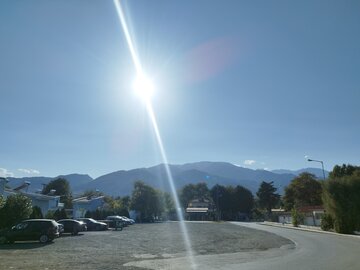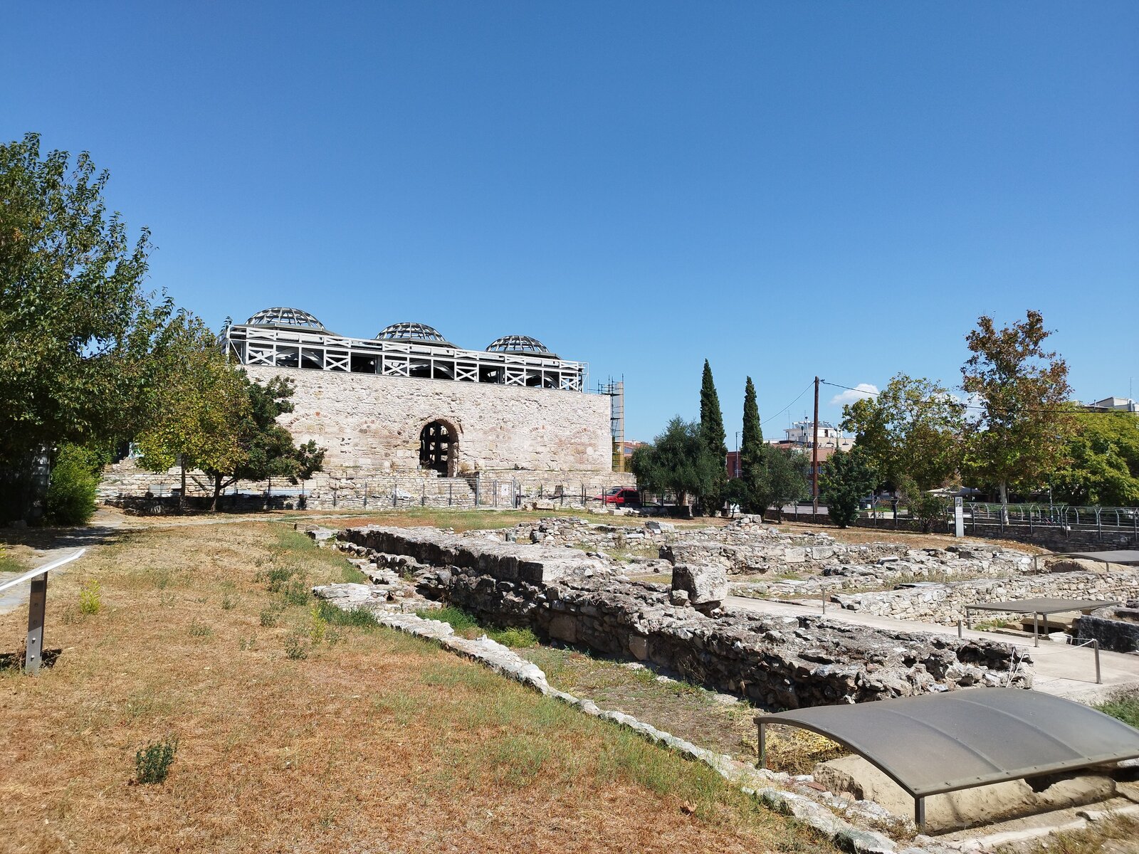 Преди Гревена, при Taxiarchis и Milea, намирам голям паркинг за тирове с беседки. Под дървената покривка е сянка, на масата от хладилната чанта вадя вода, салата и кутия боровинки, приборът е в черен калъф. Мирише на суха трева, от платното долита равномерен тътен на работещи двигатели. До паркинга има табела "The Earth Hidden Beneath Egnatia".