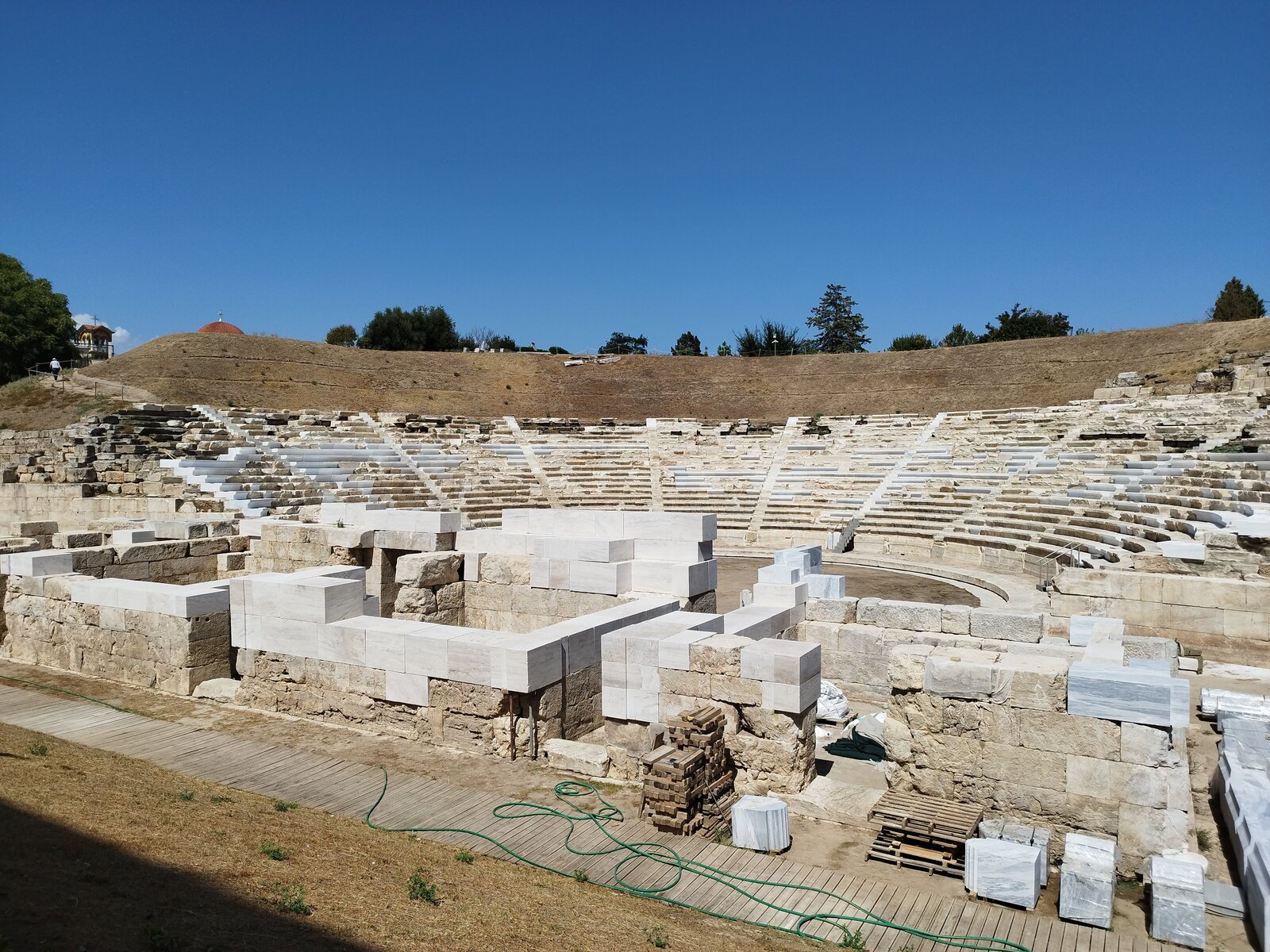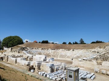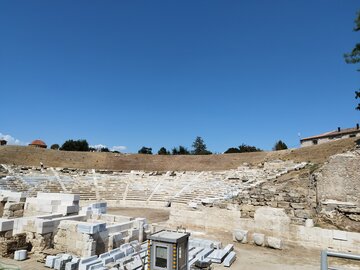 По-нататък полето е широко. Камъкът е светъл, тревата пожълтяла на петна, въздухът трепти леко над земята. Театърът стои вляво, седалките се качват нагоре в полукръг, а още по-нагоре се издига връх, който седи над всичко и събира погледа. Слизам долу в оркестъра по тесни, изтрити стъпала. В центъра има белязан камък, различен от останалите, леко отделен. Стъпвам върху него и заставам прав, така както се застава за пеене - краката стабилни, гърбът изправен, гласът някъде между гърлото и гръдния кош, готов да излезе. Първото "ла-ла-ла" излита несигурно, после второто се връща по-ясно, сякаш камъкът под краката ми го подрежда. Правя една крачка вляво, звукът се размива, още една вдясно - пак не е същото. Връщам се в центъра и оставам там, "а-а-а" тръгва нагоре към празните редове, сякаш има кой да слуша. Няма птици, няма глъч - само собственият ми глас и камъкът, който отговаря тихо.