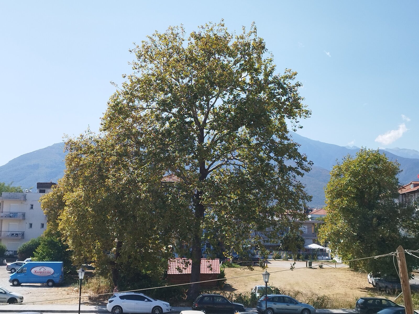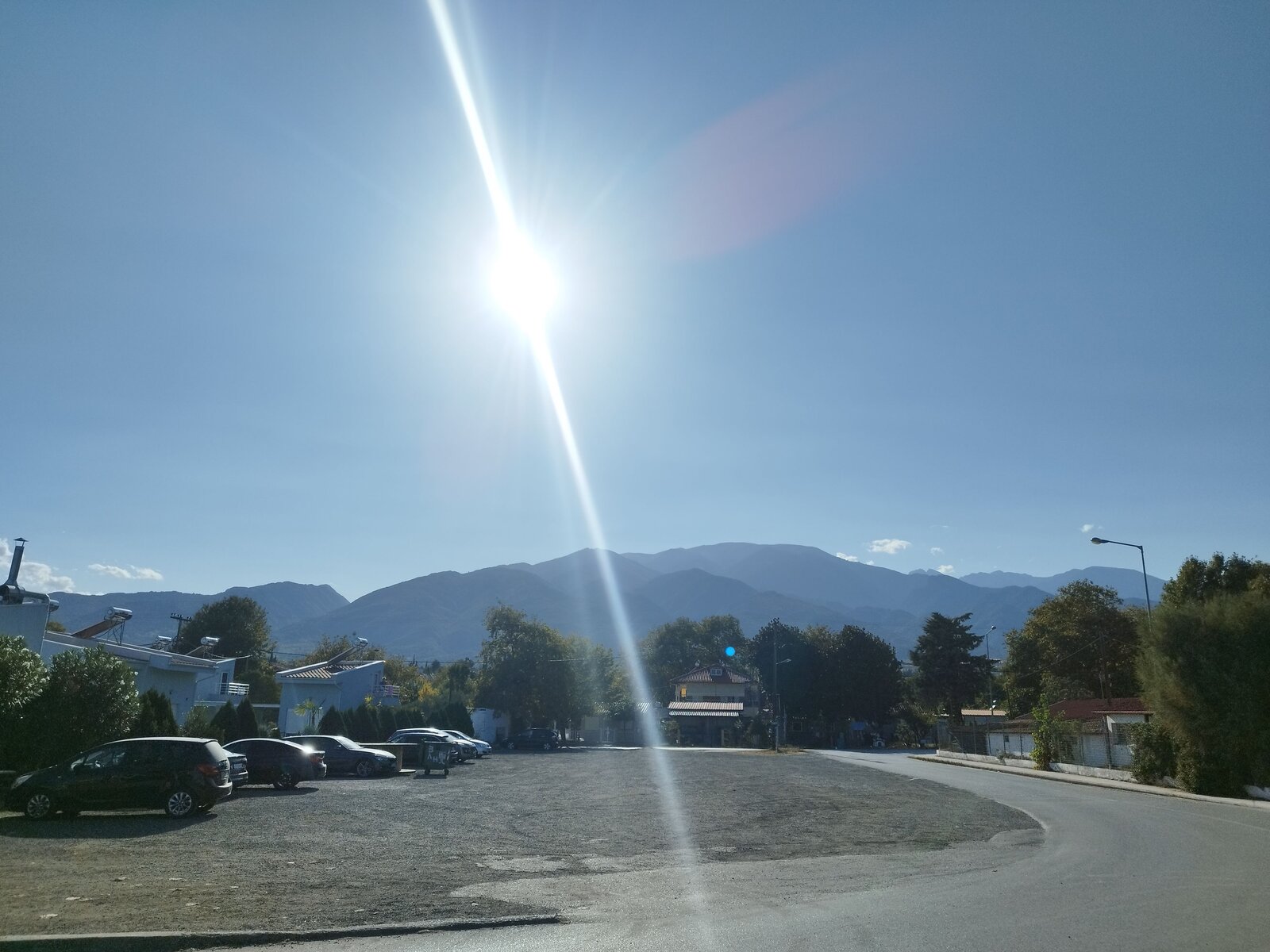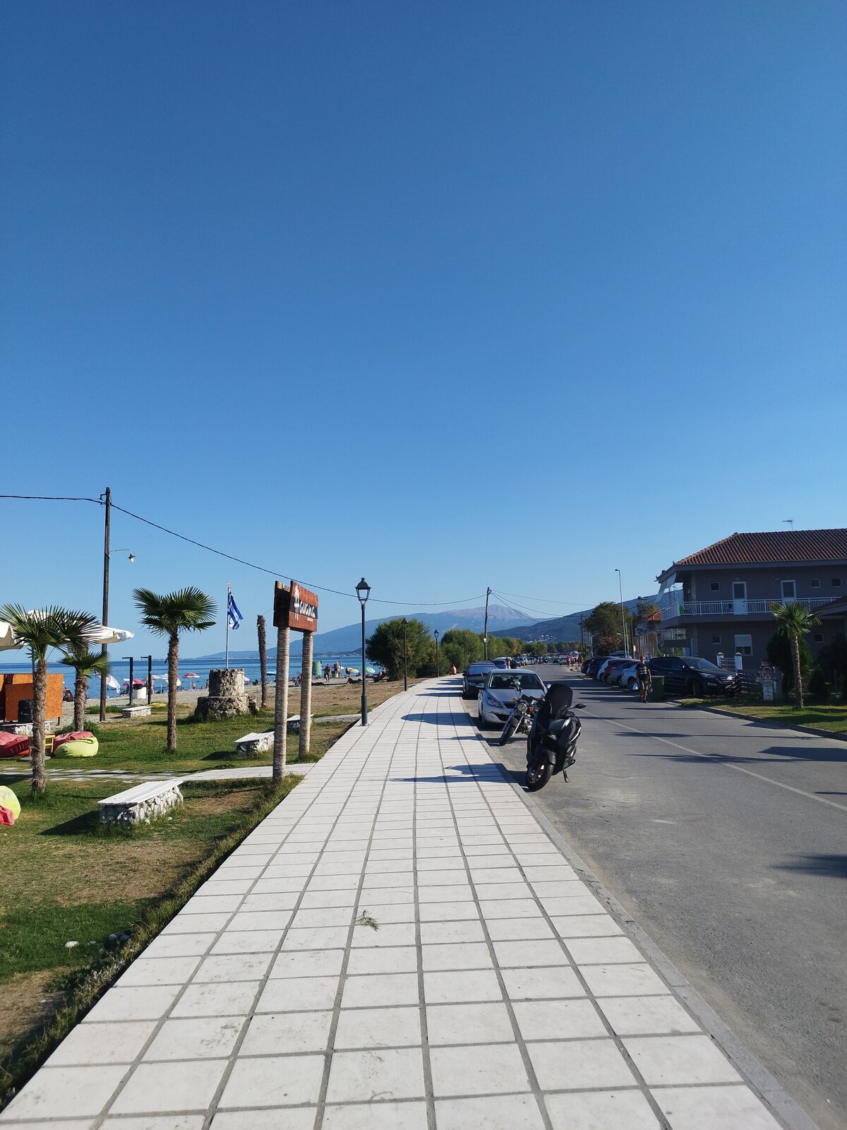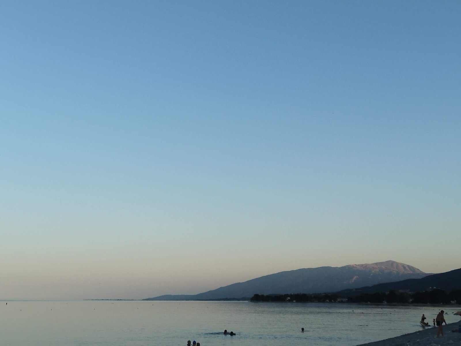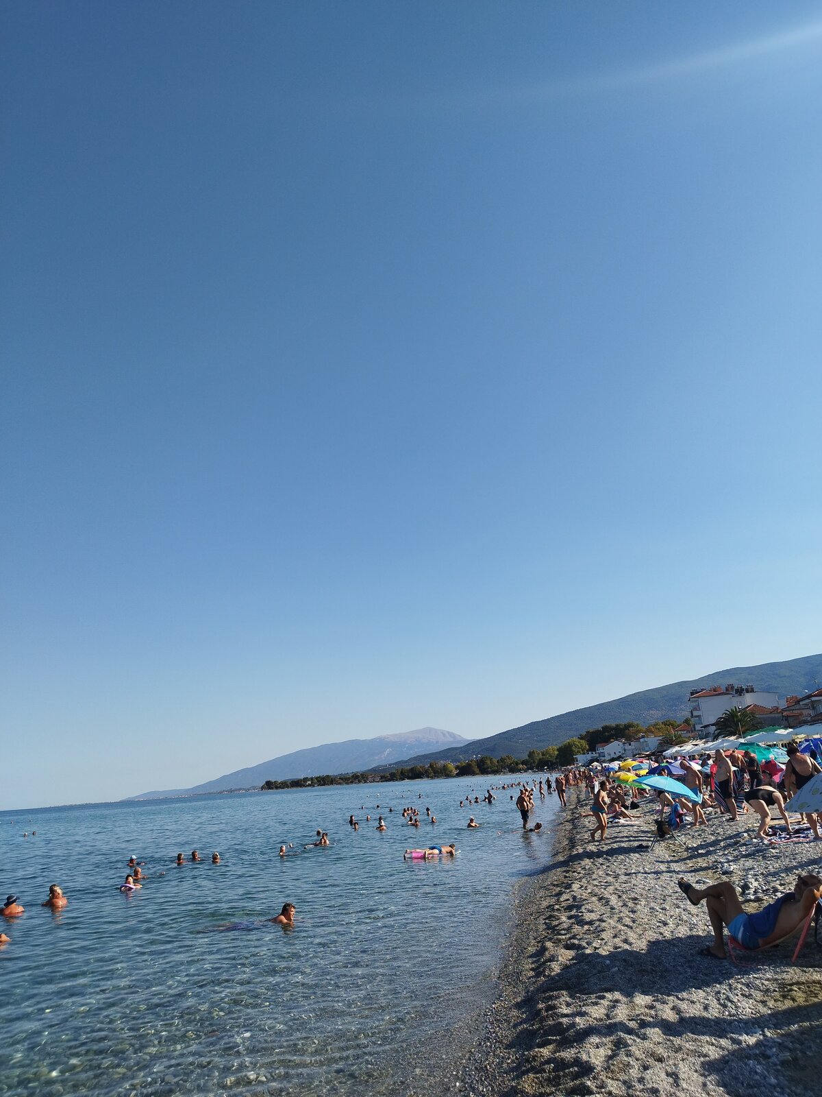 На Олимп му обърнах внимание след като стигнах Pidna Hotel. От хотелската стая би трябвало да се вижда, но имаше огромно дърво, което го прикриваше. Очаквах нещо от Олимп - усещане, сянка, дух - но той беше зад гърба и изобщо не се усещаше. Хотелът беше на морето. Настаних се, видях плажа. Разходих се край плажната ивица, за да заснема Олимп - изцяло си струваше. Тъкму видях, че плажната ивица е много дълга и е пълна с хора. Вървях по крайбрежната линия точно до плажа, по асфалт, край морето в Leptokarya (Λεπτοκαρυά). Чуваха се хора - стандартен шум на крайморското градче, туристи, магазини, лавки - а водата беше спокойна и много тиха. После се върнах в хотела за плажна кърпа - бързах да се топна, защото времето беше страхотно. Вятър нямаше, въздухът изобщо не се движеше. Светлината добавяше магия. Залязващо слънце - исках гледка. И водата беше заедно: звук, допирът, самото ѝ движение - и, разбира се, толкова гладка и защеметяваща равна повърхност до хоризонта. Изморителен ден, нямах сили за вечеря. Прибрах се в хотела, набелязах Драма като утрешна дестинация и заспах леко нещастен. Олимп бе разочарование - от детството и разкази за древната Гърция очаквах повече от неговата близост.