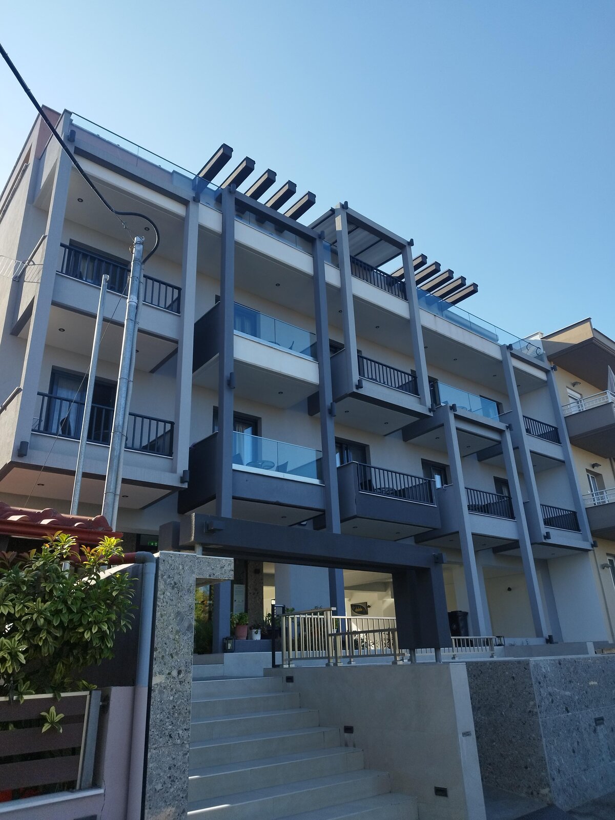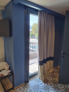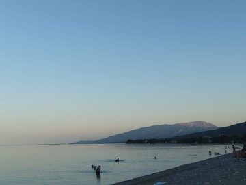 Пътят към Παραλία Αγία Παρασκευή минава по хълмове. Завои, склонове със зелено, между дърветата от време на време проблясва лента вода, после пак изчезва. Асфалтът е добър, движението не е тежко, умората от Янина и Додона вече се усеща, но мисълта е проста - хотел, легло, море наблизо. Когато стигам до Aqua Oliva Resort, комплексът стои подреден и спокоен, сгради на няколко нива, басейн по средата, всичко някак по-хубаво, отколкото изглеждаше на екрана. На рецепцията ме посреща много симпатична жена с отлично произношение на английски. Разговорът върви лесно, без обяснения на пръсти, без недоразумения. Докато ми подава картата за стаята, се усеща онова малко отпускане - за днес няма повече да се шофира, няма повече планове, има само събиране на деня. Басейнът отвън е син правоъгълник, тих, с няколко шезлонга наоколо, водата стои неподвижна, като да чака някой да си спомни за нея. Стаята е чиста и светла. Оставям багажа, отварям вратата към терасата и излизам. Оттук морето не се вижда - пред мен са само други сгради от комплекса, малко зеленина, планината и небето над нея. Фасадата отпред точно покрива линията, където трябва да е водата, и я скрива малко над хоризонта. Не ми пречи - денят така или иначе е минал през достатъчно гледки. Планината стои спокойно, небето над нея е светло и чисто, а някъде отдолу, зад покривите, Йонийско чака. Към плажа слизам по-късно. Той е каменист, камъчетата под краката леко потракват, нищо общо с мек пясък. Морето тук е по-солено от Черно море - вкусът остава по устните, по-силен е, усеща се веднага. Вълните са дребни и мързеливи, търкалят се до камъните без усилие, повече люлеене, отколкото удар. Морето е напълно спокойно, плътна, равна повърхност с леки гънки. Късно вечер вече почти няма хора. Няколко светлини от заведения и хотели стоят назад по линията на брега, но до самата вода е тъмно. Чува се основно морето - равномерен, тих шум на малки вълни, които идват и се прибират, без да бързат. След дългия ден спокойствието е пълно, нищо не натиска за следваща стъпка, няма къде да се бърза. Стоя на камъните, слушам Йонийско и оставям деня да свърши тук, преди да се върна нагоре към хотела.