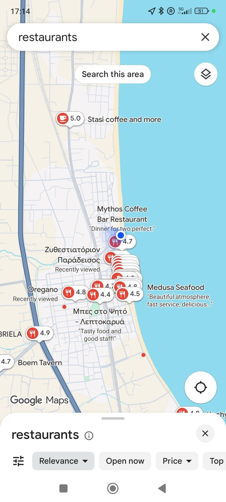 За обяд се премествам на няколко крачки по-нагоре, в малкото заведение до плажа. Чиниите идват бързо - салата, нещо основно, после още един малък жест към себе си. От масата виждам същата ивица с лежанки и същия остров, просто от малко по-висока гледна точка, така че суетата преминава пред погледа ми като бавна сянка в тиха сцена. По навик накрая искам десерт и кафе, но този път решавам да пробвам гръцко кафе така, както сервитьорът сам го пие. Оставям чашата да постои на масата между празните чинии и морето отпред.