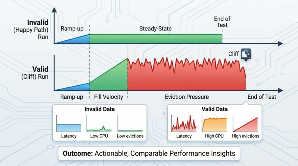 Once that's nailed down, the one-hour reports stop being "fresh-cache performance" and start being comparisons of how configurations behave at the cliff.